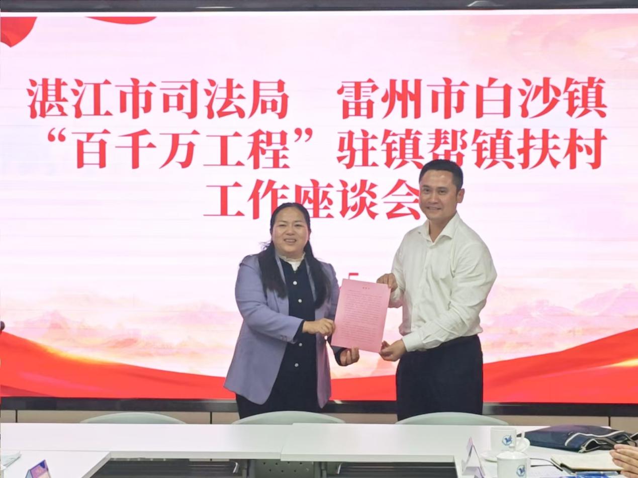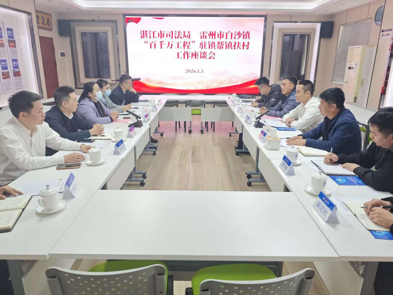 2026年1月5日,雷州市白沙镇党委书记张进率队赴驻镇帮镇扶村牵头单位湛江市司法局开展拜会,专题汇报驻镇帮镇扶村工作进展,并就下一步帮扶工作计划进行交流。双方还围绕AI技术赋能基层治理开展专题学习。湛江市司法局书记罗东玲及相关负责同志参加座谈。
