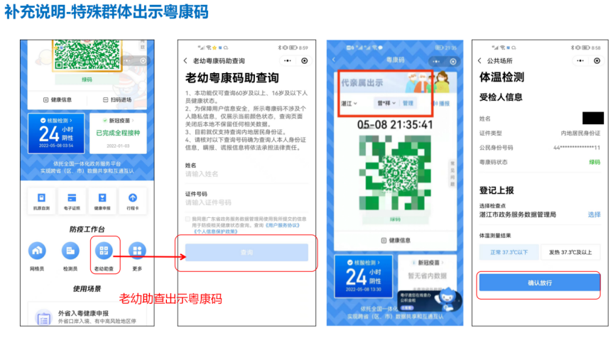 答:不方便使用智能手机的老年人、未成年人等群体可采用纸质粤康码或同行代为出示粤康码,检测员须使用本人手机粤康码工具扫群众粤康码进行查验。对于使用手机不便不能出示粤康码的老幼群体,可采取人工登记(内容包括:姓名、性别、有效联系方式)等方式处理。