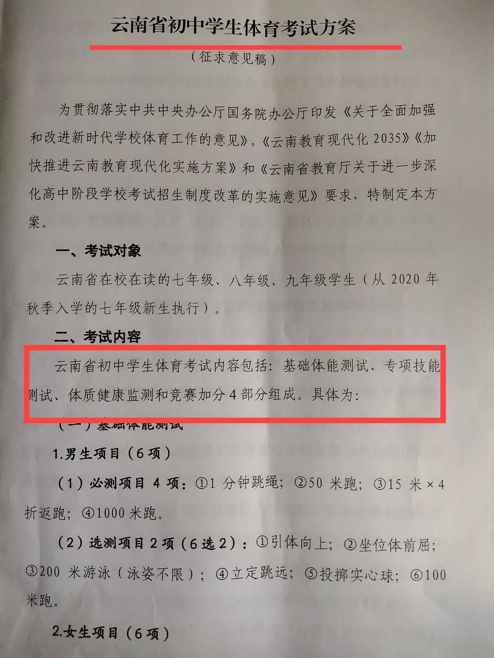 云南省初中学生体育考试方案提出,将考试由原来的“三年一考”变为“一年两考”,每学期均采用“随时考”和“定时考”相结合的方式。100分由初一20分、初二40分、初三40分三部分构成。每学年得分均由上学期得分、下学期得分和竞赛加分组成。