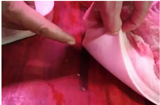 采用出血点辨别法:病猪周身皮肤,包括头和四肢皮肤上都有大小不一的鲜红色出血点,肌肉和脂肪也有小点出血。全身淋巴结(俗称“肉枣”)呈紫色,肾脏贫血色淡,可见出血点。个别肉贩常将猪瘟病肉先用清水泡上一夜,第二天再上市销售。这种肉外表显得特别白,虽然表面上看不见有出血点,但将肉切开后从断面上看,脂肪、肌肉中的出血点依然明显。