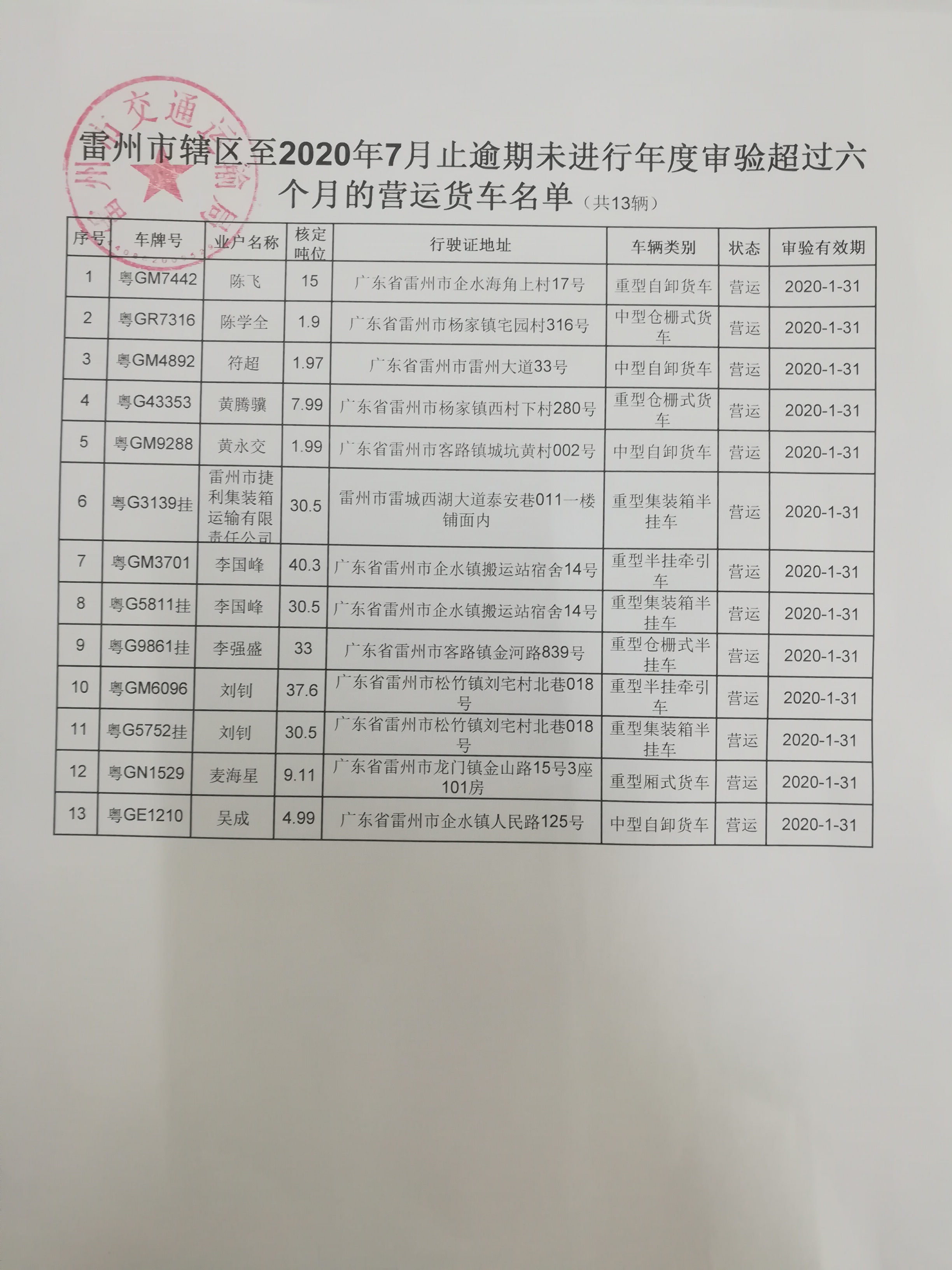 关于注销雷州市辖区至2020年7月止逾期未进行年度审验超过六个月的营运货车的名单(共13辆).jpg