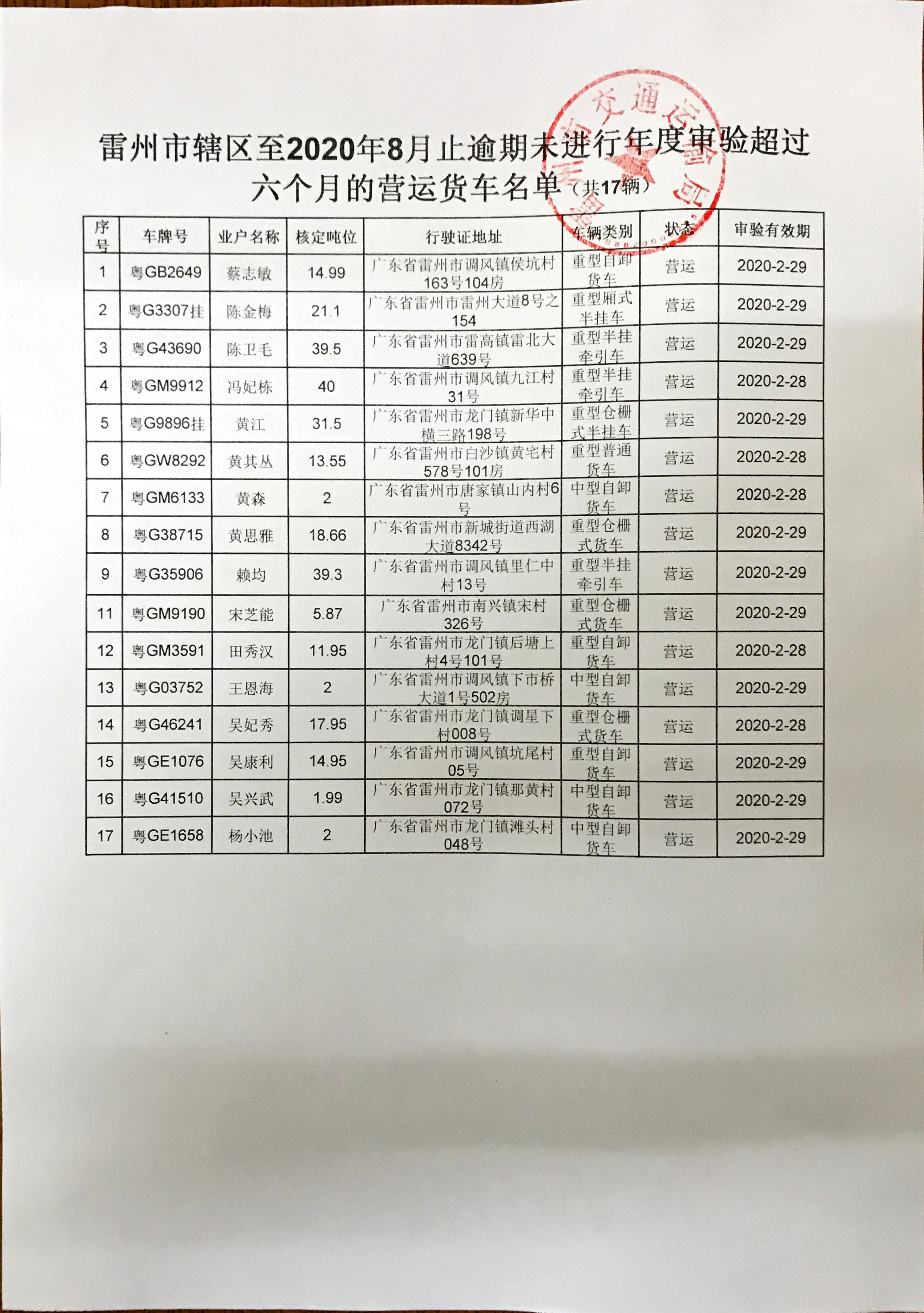 雷州市辖区至2020年8月止逾未进行年度审验超过六个月的营运货车名单.jpg