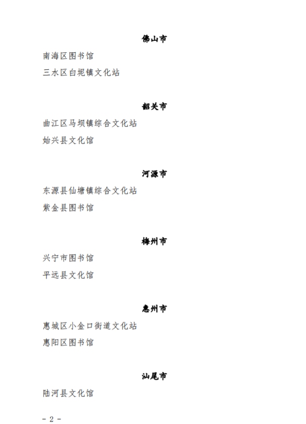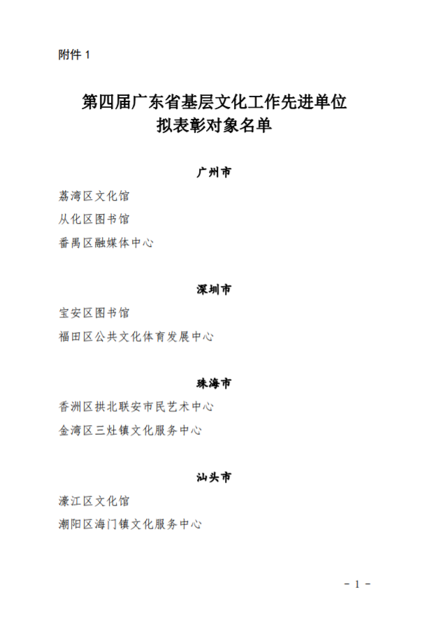 日前,经组织推荐、评审等程序,并经省文化和旅游厅党组审定,广东省文化和旅游厅人拟授予广州市荔湾区文化馆等38个单位第四届“广东省基层文化工作先进单位”荣誉称号,拟授予孔玉华等79名同志第四届“广东省基层先进文化工作者”荣誉称号。