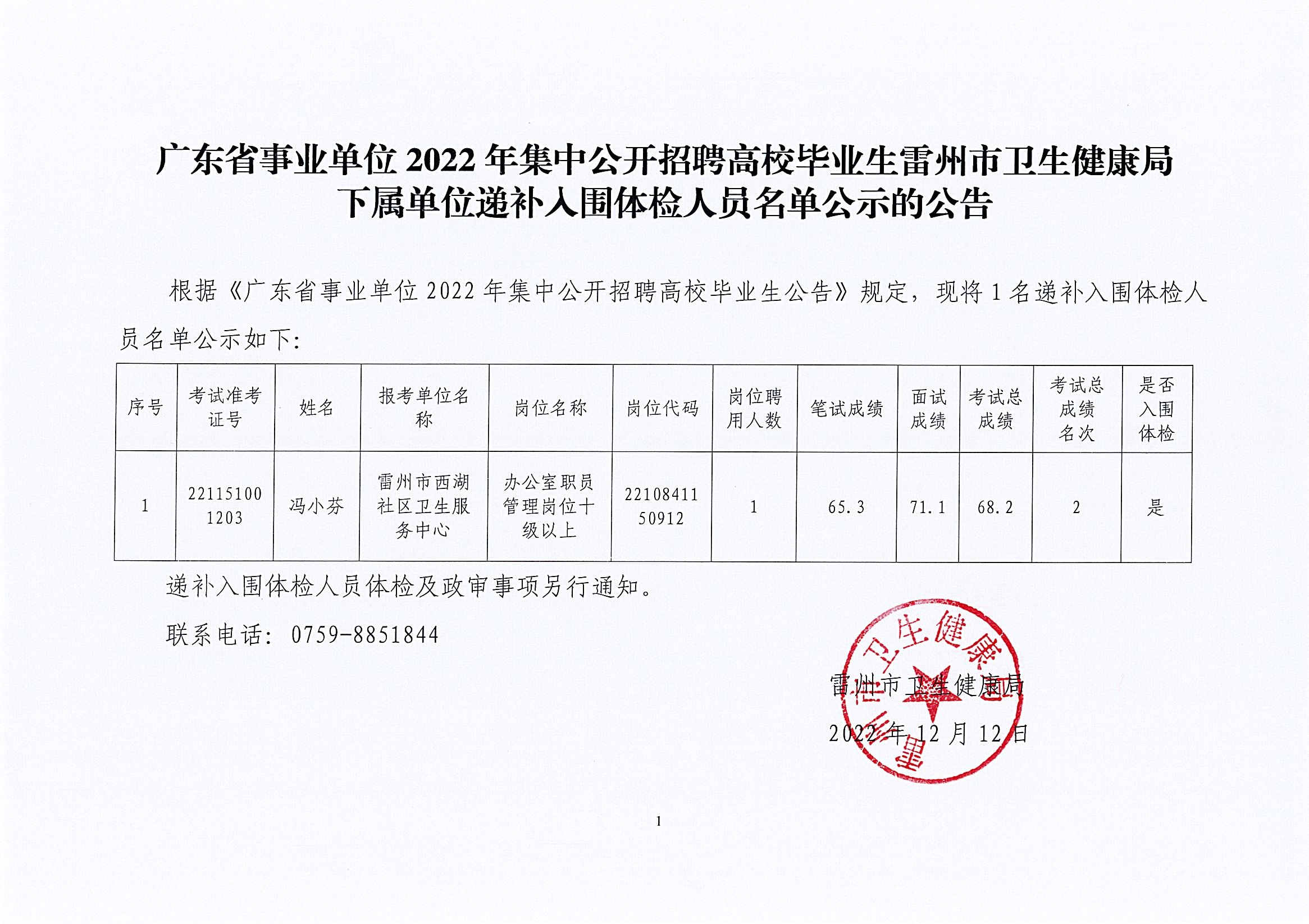 广东省事业单位2022年集中公开招聘高校毕业生雷州市卫生健康局下属单位递补入围体检人员名单公示的公告