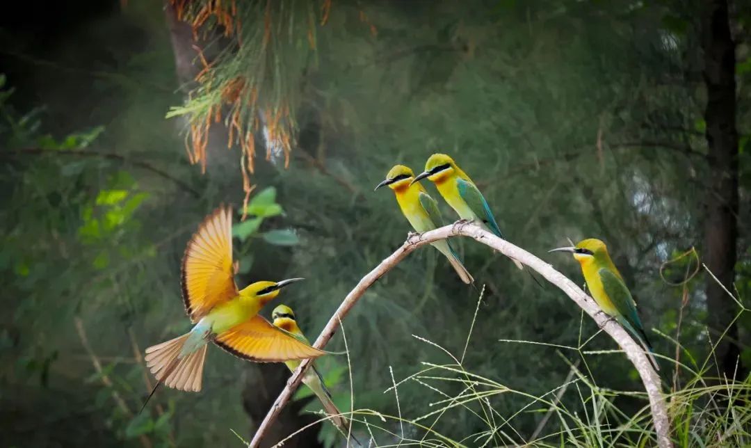 据了解,蜂虎鸟是国家二级保护鸟类,属珍稀鸟类,全世界共有蜂虎鸟26种,主要生活在东南亚一带,在我国的福建、云南、广东、海南等地有分布。蜂虎鸟羽色艳丽,翅膀尖细,因以捕捉蜜蜂、胡蜂、蜻蜓等昆虫为食,故名“蜂虎鸟”。其体长26—28厘米,因炫目艳丽且带有金属色泽质感的羽毛,极具观赏性,被称为“中国最美丽的鸟”