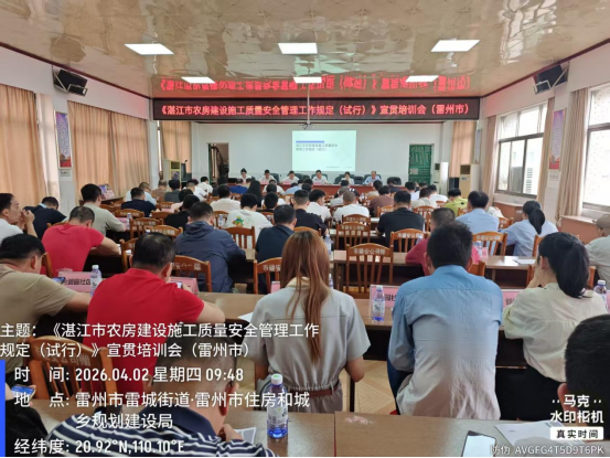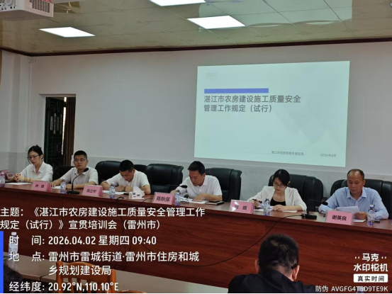 为深入贯彻《湛江市农房建设施工质量安全管理工作规定(试行)》,全面提升我市农房建设质量安全管理队伍的工作水平和综合行政执法能力,强化质量安全意识,压紧压实建设监管责任,2026年4月2日上午,雷州市住建局组织召开《湛江市农房建设施工质量安全管理工作规定(试行)》宣贯培训会议。会议由市住建局总工程师谢英良主持,市住建局相关股室(站)人员,21个镇(街)农房管理工作分管领导、规划建设办、综合行政执法队以及新城街道办的8个社区共约100人参加此次培训会。