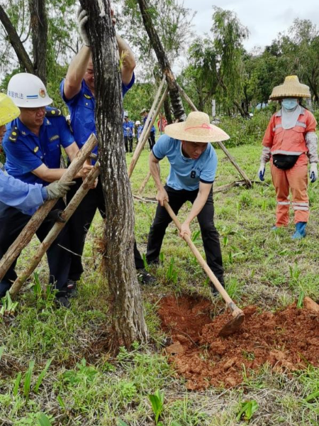 活动当天,“城管蓝”与“生态绿”相互映衬,成为了西湖碧道最靓丽的一道风景线,雷州市城综局的广大干部职工用汗水诠释了责任担当,用实际行动演绎了奋斗本色。在大家的共同努力下,西湖碧道的1500余株倒伏树木已扶正加固完毕。