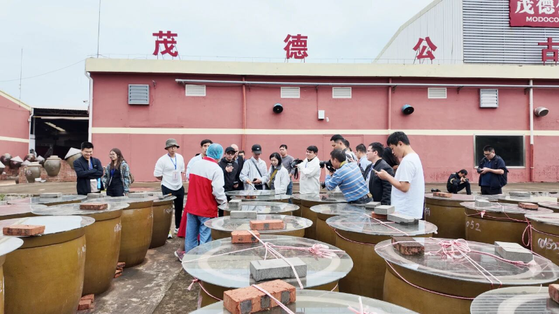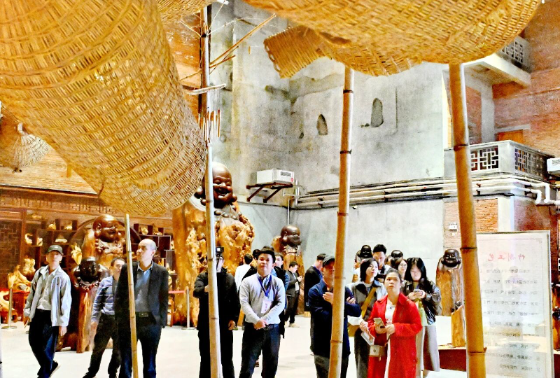在足荣村,媒体记者们分别走大观园手作博物馆、茂德公古法酱油晒场和乡村咖啡屋探访。手作博物馆悬挂的竹编器物、造型各异的根雕、威风凛凛的醒狮道具等各式各样、琳琅满目,引得媒体记者们光影不停。茂德公古法酱油晒场,有序排列着数百只酱缸,一行行尉为壮观,工作人员一边操作长勺舀油,一边给记者们介绍传统酿造工艺的精髓,让大家大开眼界。乡村咖啡屋,以废弃石块巧妙堆砌而成,别具特色成为足荣村文旅融合的又一缩影,受到媒体记者们的赞赏。期间,记者们或拍照记录,亲身感受文化传承等给乡村经济和生活带来的发展变化。