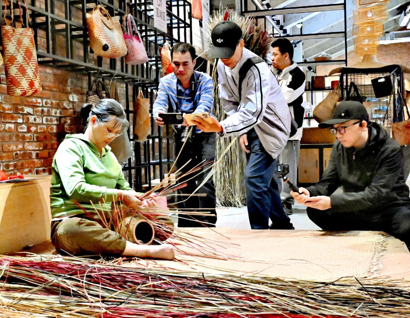 在足荣村,媒体记者围绕蒲编匠人探访乡村文化与产业。