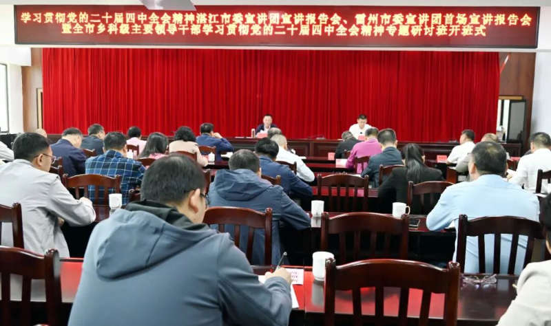 11月25日,雷州市举办学习贯彻党的二十届四中全会精神湛江市委宣讲团宣讲报告会、雷州市委宣讲团首场宣讲报告会暨全市乡科级主要领导干部学习贯彻党的二十届四中全会精神专题研讨班开班式。湛江市委宣讲团成员、雷州市委书记、学习贯彻党的二十届四中全会精神雷州市委宣讲团团长吴松江作宣讲主题报告暨开班讲话,强调要深入学习贯彻习近平总书记视察广东重要讲话、重要指示精神,认真落实党中央及省委、湛江市委部署要求,通过理论宣讲凝聚全市智慧和力量,推动党的二十届四中全会精神落地落实,扎实做好“十四五”收官和“十五五”规划各项工作,奋力开创雷州现代化建设新局面。市委副书记、市长闫嘉伟主持会议。