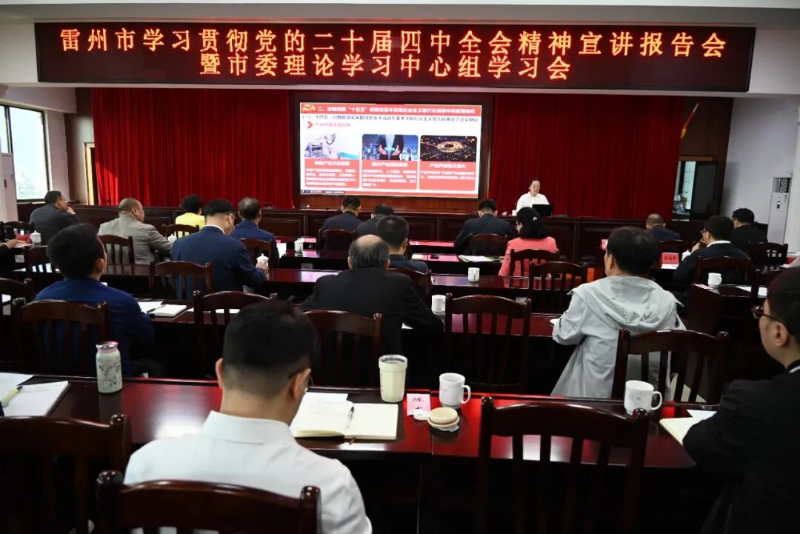 12月19日,为深入学习宣传贯彻党的二十届四中全会精神,引导全市广大党员干部深刻领会、准确把握全会的核心要义与实践要求,切实推动全会精神在雷州落地生根、开花结果,雷州市举行学习贯彻党的二十届四中全会精神宣讲报告会暨市委理论学习中心组学习会。市委理论学习中心组成员,市直单位有关负责同志在主会场参会,各镇(街)党政主要领导、宣传委员等在分会场参加。市委常委、宣传部部长程丹丹主持会议。