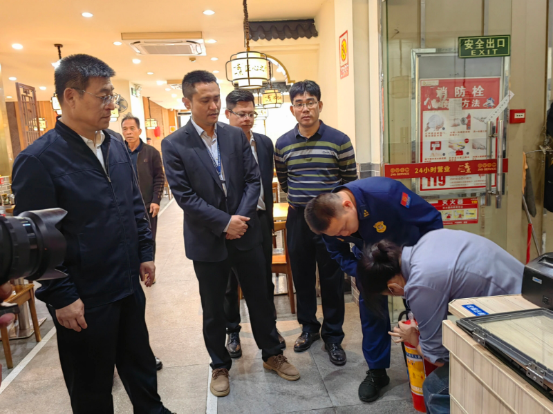 随后,闫嘉伟一行前往雷州市一茶一点阳光美食店,检查“九小场所”消防安全隐患整治情况。他逐一查看安全出口、疏散通道是否畅通,细致检查灭火器材是否完好有效,现场要求工作人员演示灭火器使用方法,并深入后厨检查燃气使用环节,逐一排查潜在隐患。他强调,此类场所人员密集、流动性强、风险点多,经营者要制定完善应急预案,加强员工消防安全培训,严格落实值班值守制度,把风险化解在萌芽状态,全力守护群众“舌尖上的安全”。