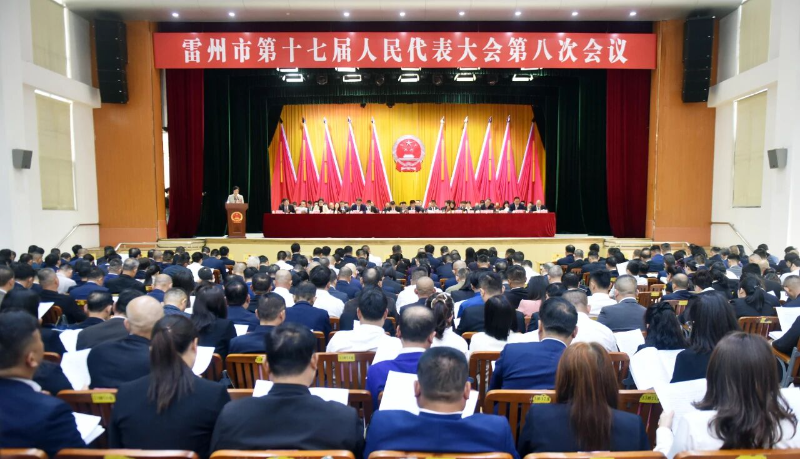雷州市十七届人大八次会议主席团常务主席吴松江、魏晓燕、游学昌、陈家祥、陈小华、李杨林、周行璋、薛强在主席台前排就座。在主席台就座的还有市四套班子在家领导等。