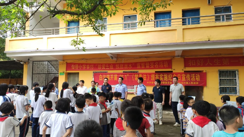 为深入贯彻宣传《中华人民共和国禁毒法》,助力构建无毒校园,5月30日,白沙镇政府在白沙镇仙桥小学开展“6.1”禁毒法颁布实施日宣传活动,镇党委副书记梁礼问、派出所副所长陈尔达等领导出席活动,白沙派出所民警、镇综治办、禁毒办全体工作人员、官茂村委会干部、仙桥小学全体师生等200多人参加活动。