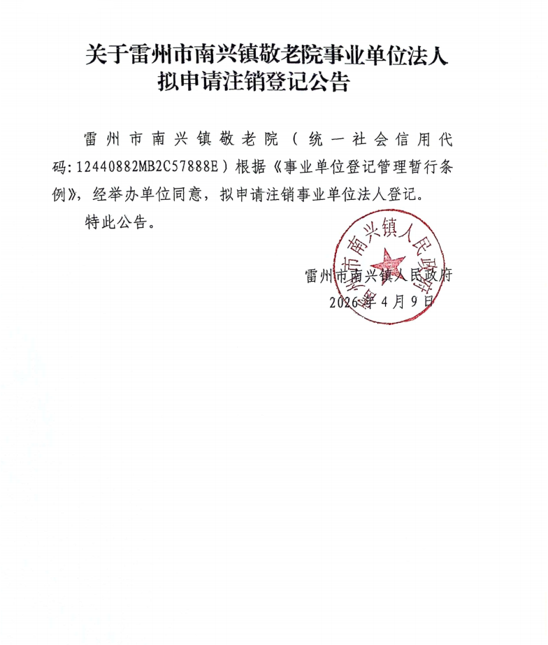 关于雷州市南兴镇敬老院事业单位法人拟申请注销登记公告