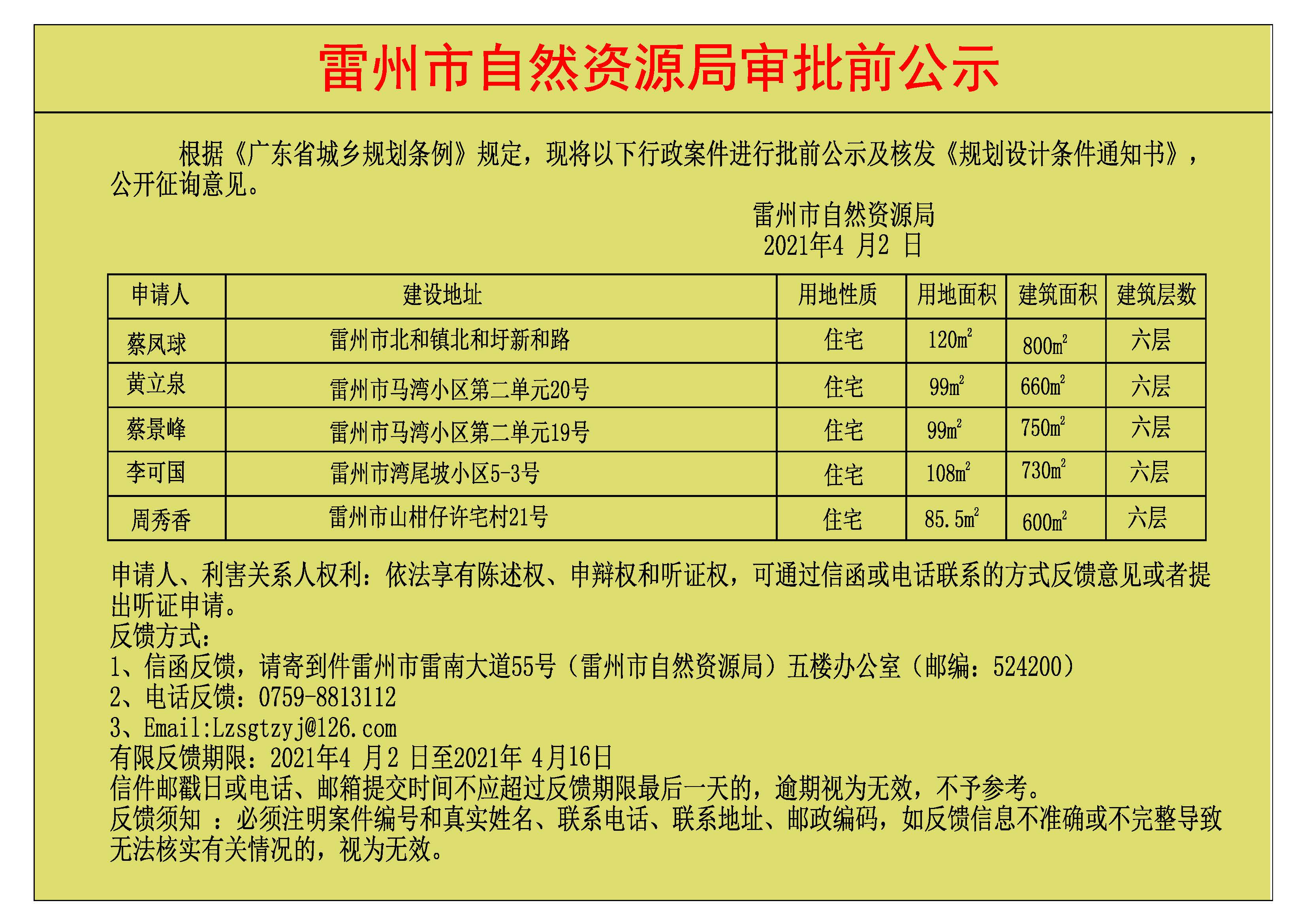 关于蔡凤球.黄立泉.蔡景峰.李可国.周秀香批前公示及核发《规划设计条件通知书》