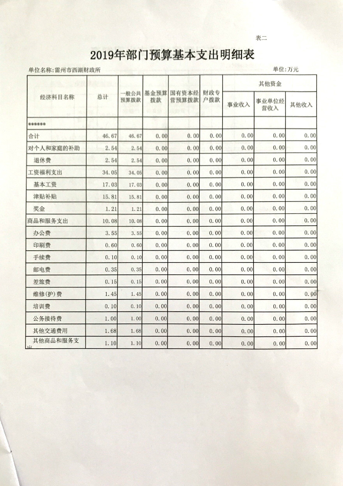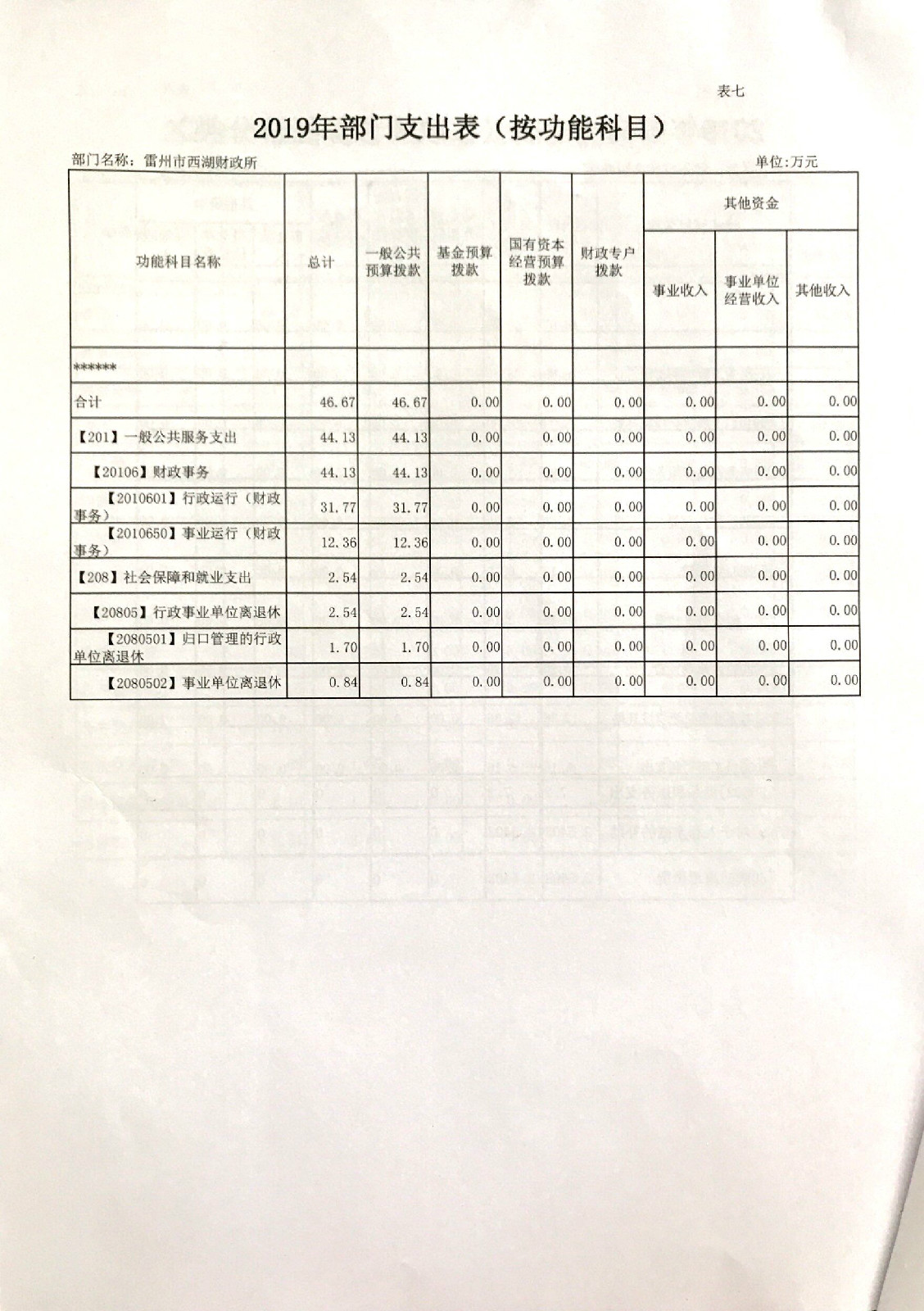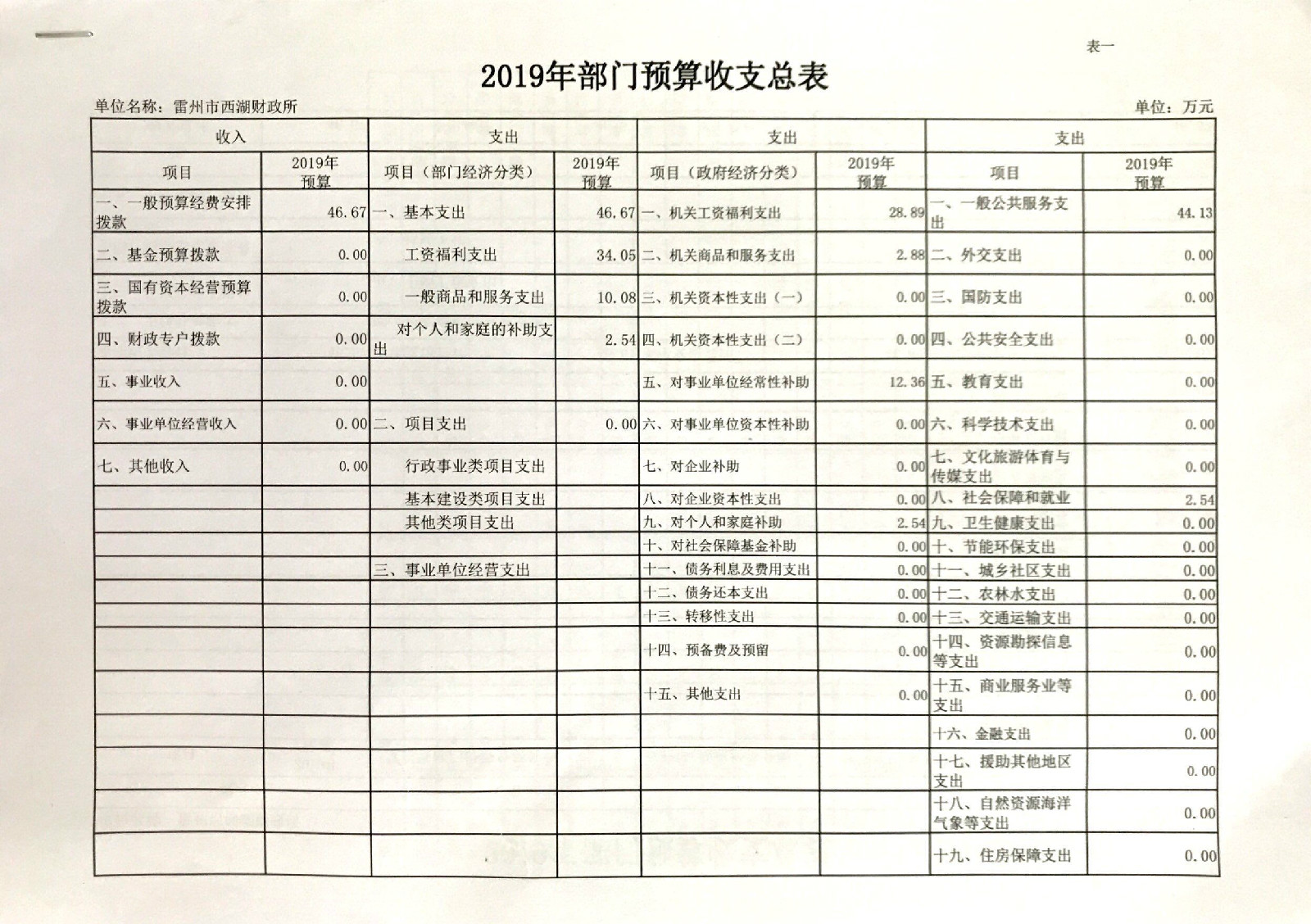 2019年西湖财政所预算公开