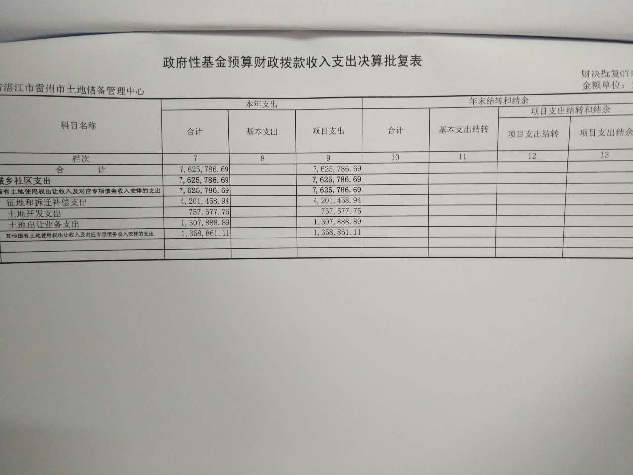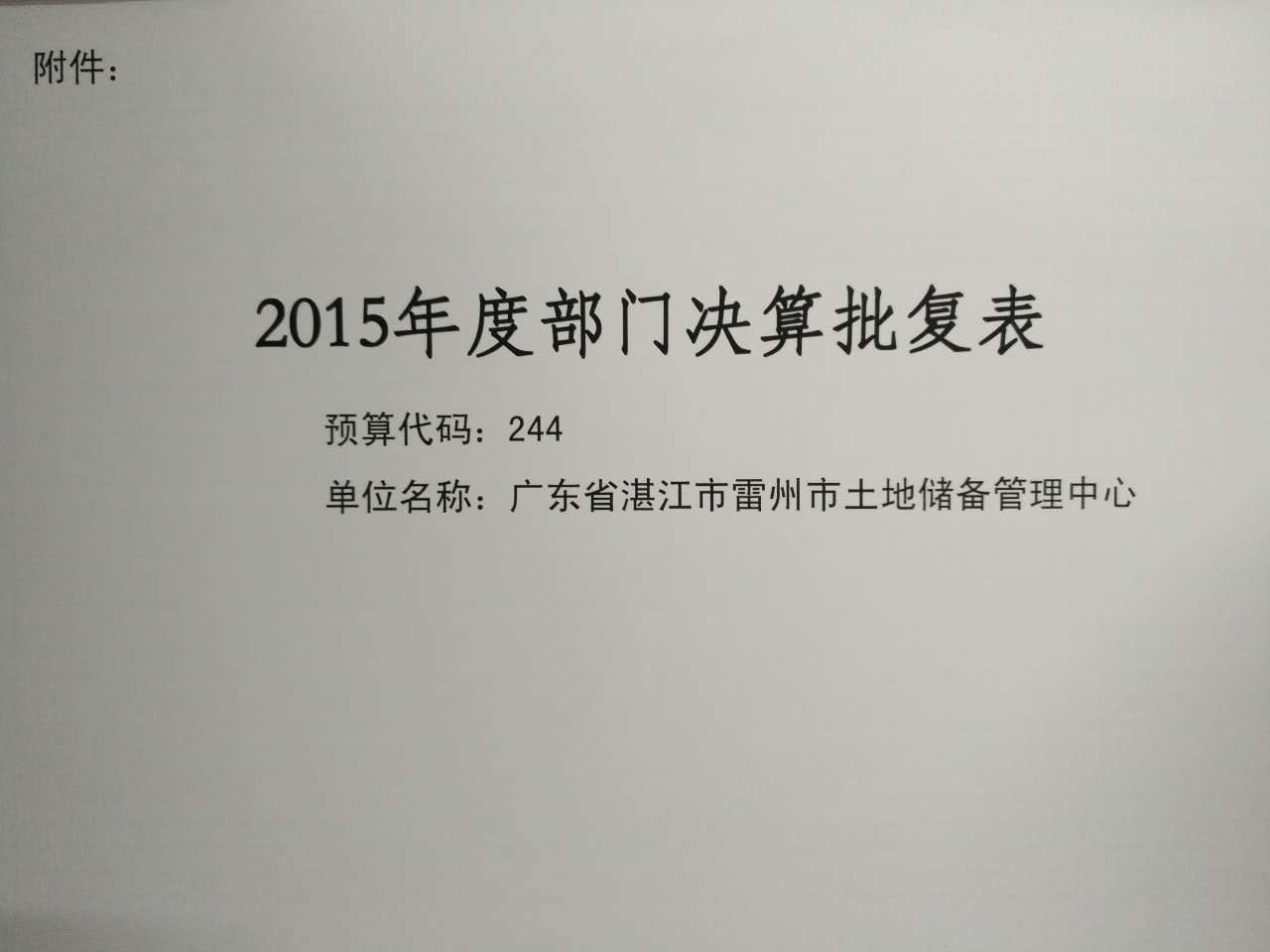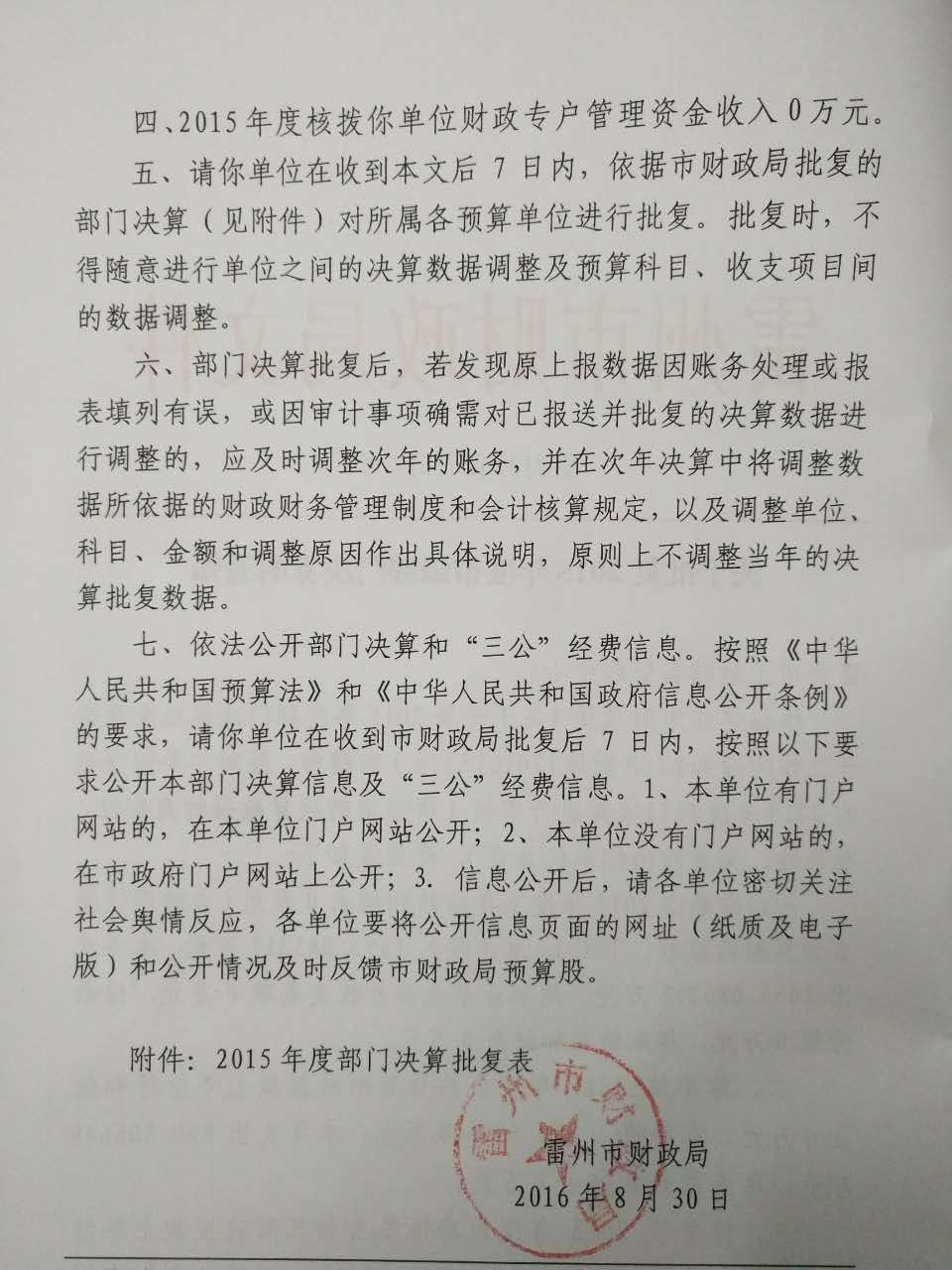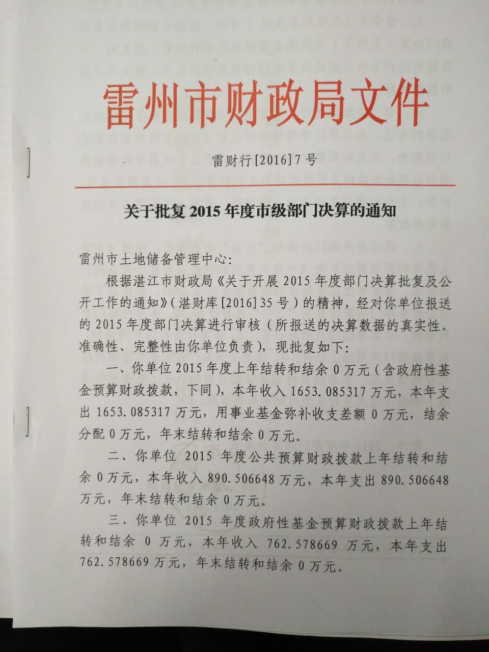 2015年雷州市土地储备管理中心决算批复公开