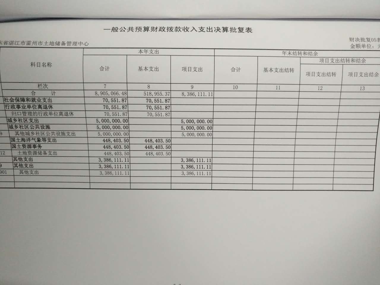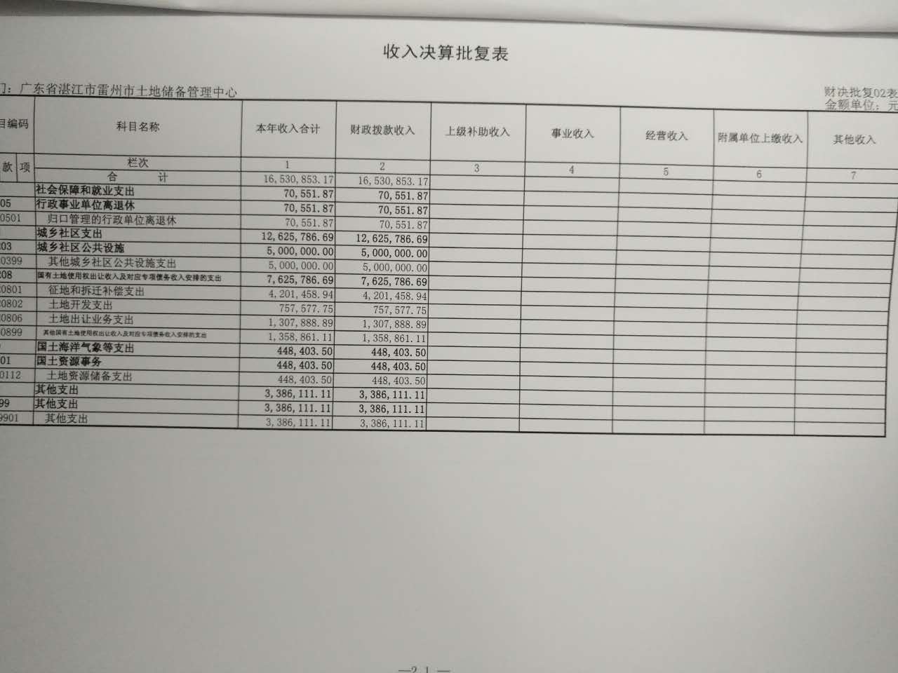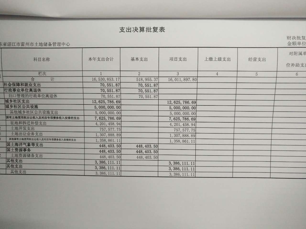 2015年雷州市土地储备管理中心决算批复公开
