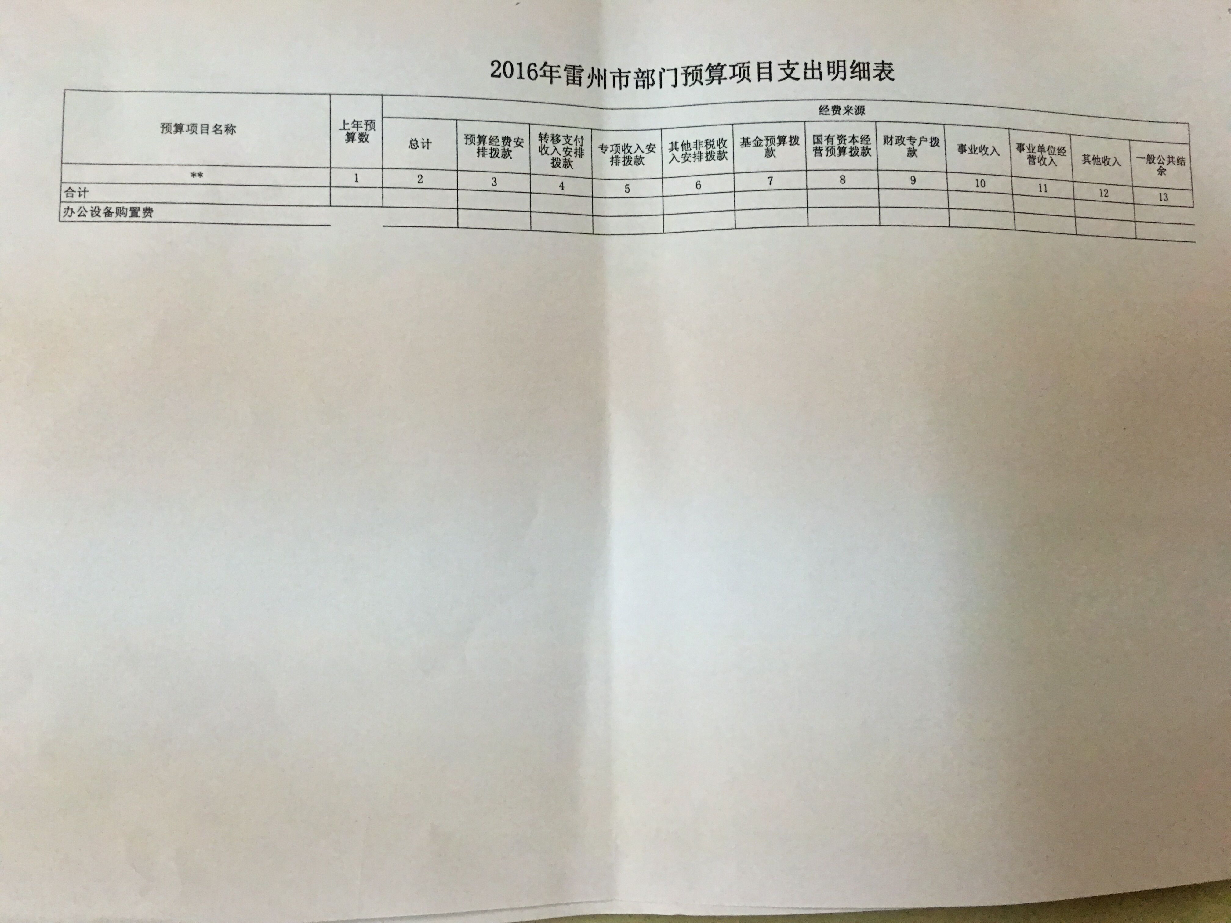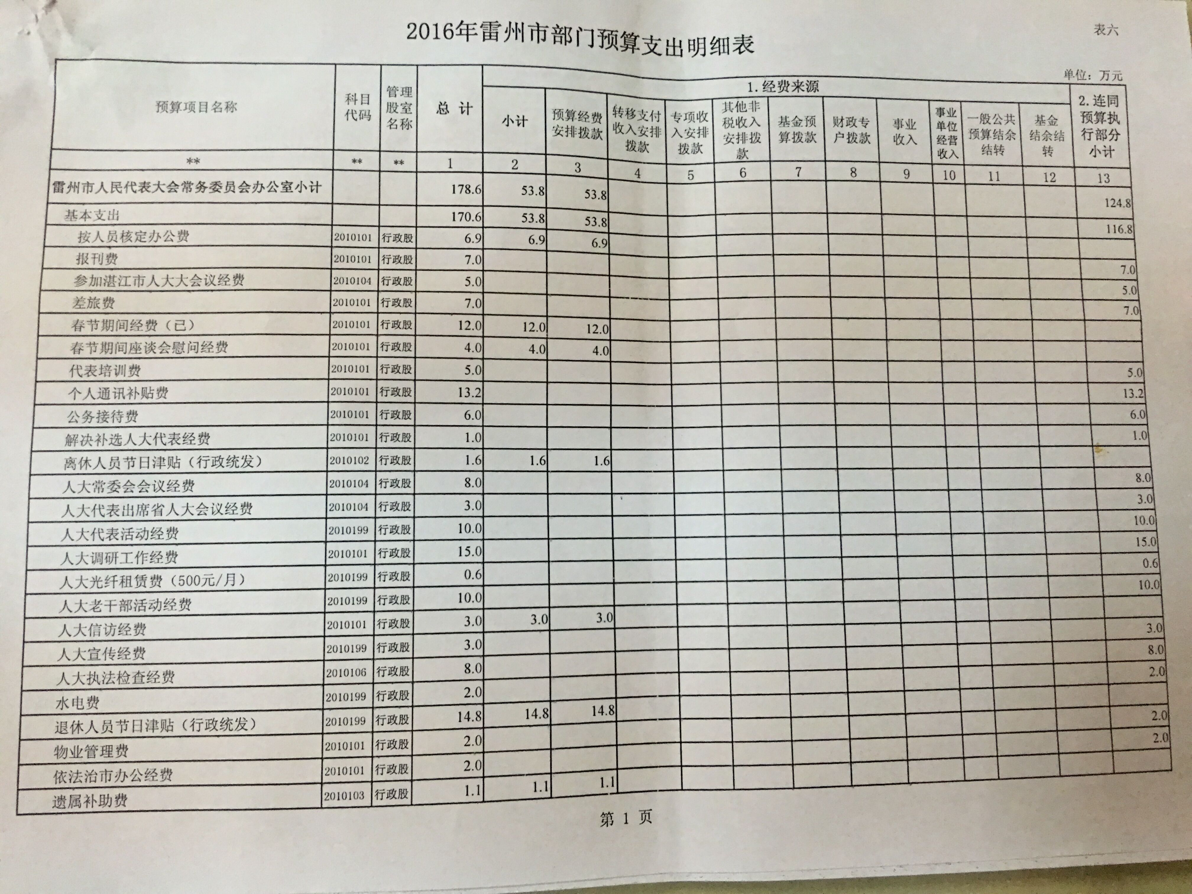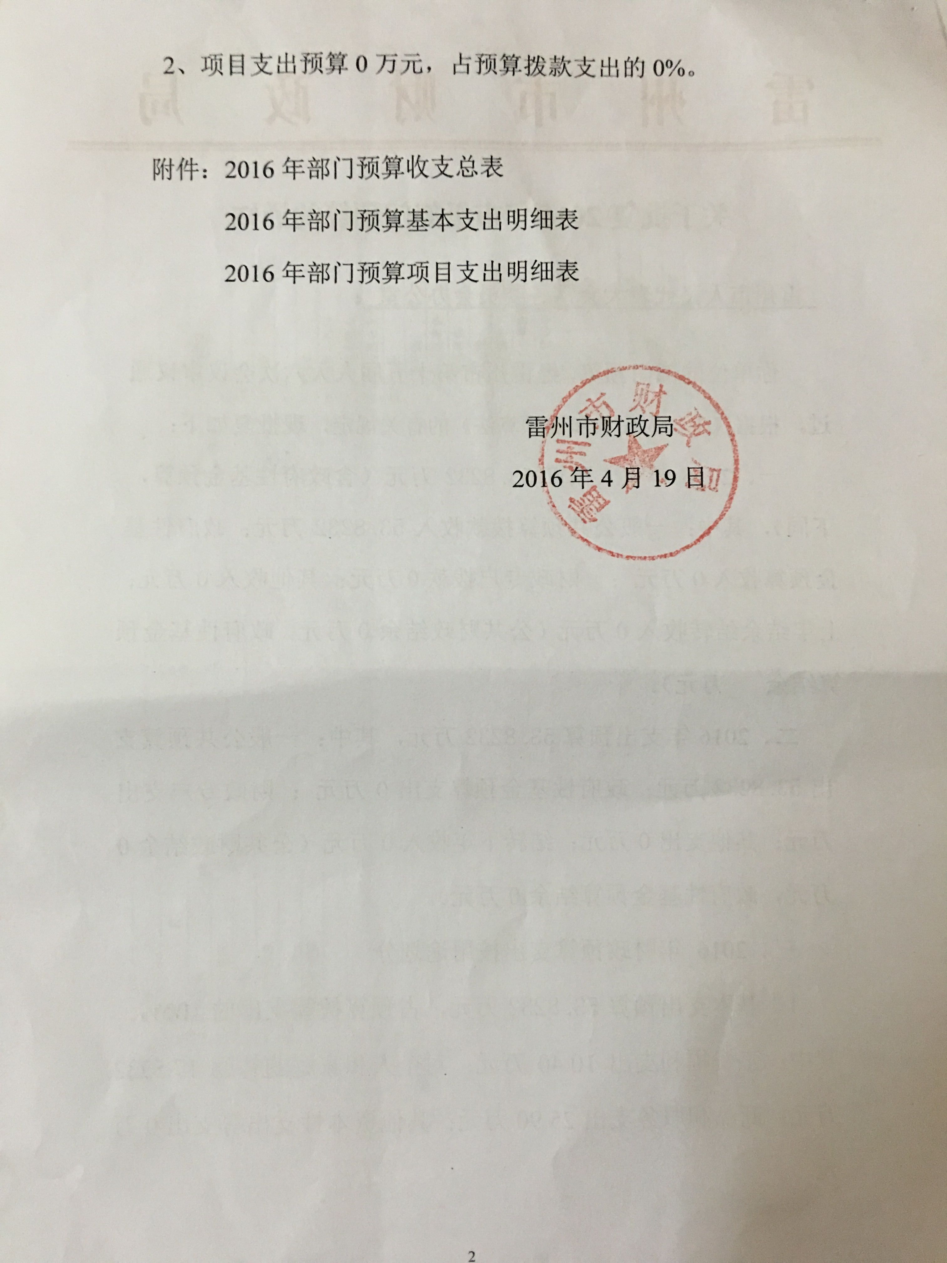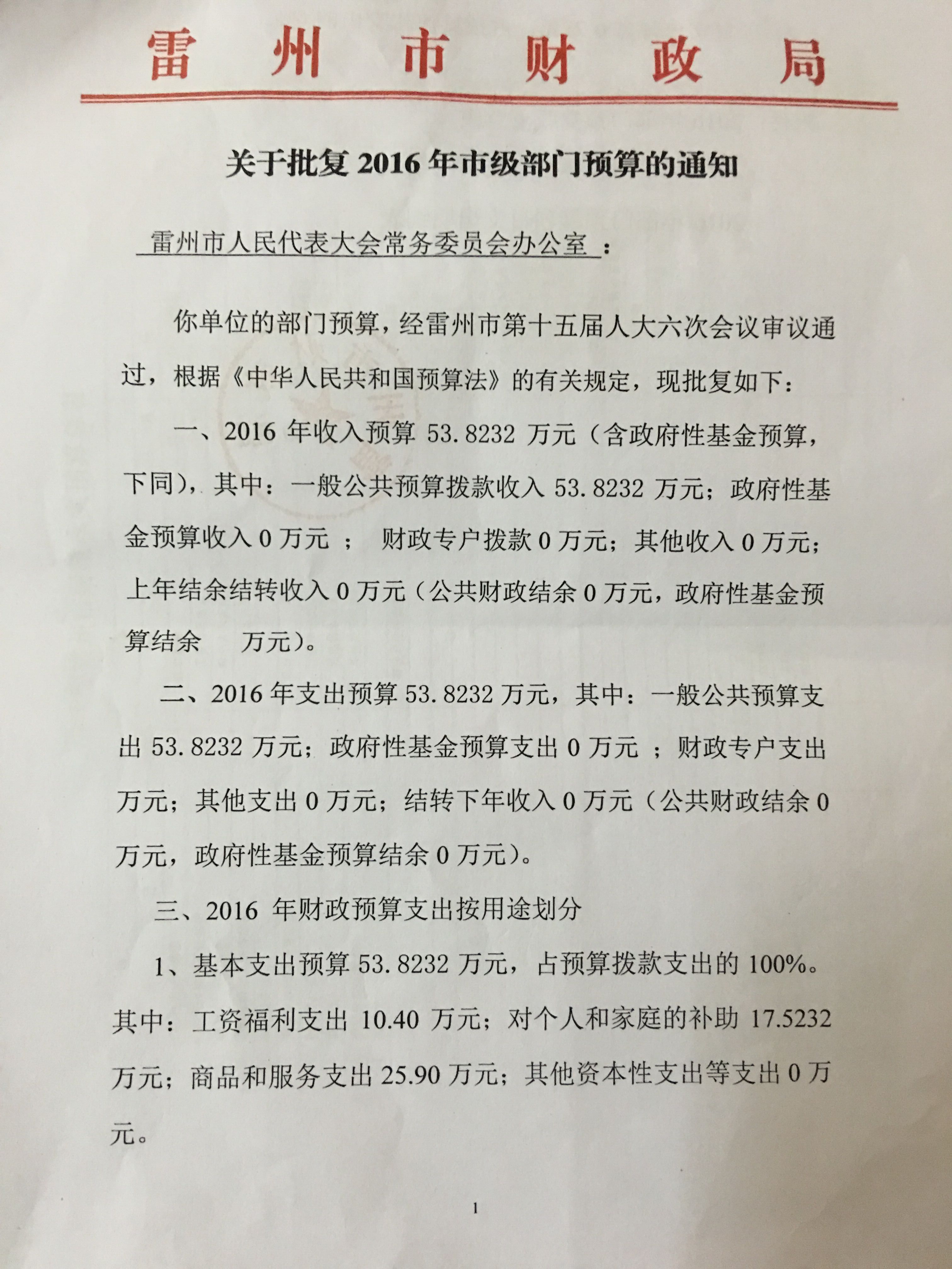 雷州市人大办公室2016年预算公开