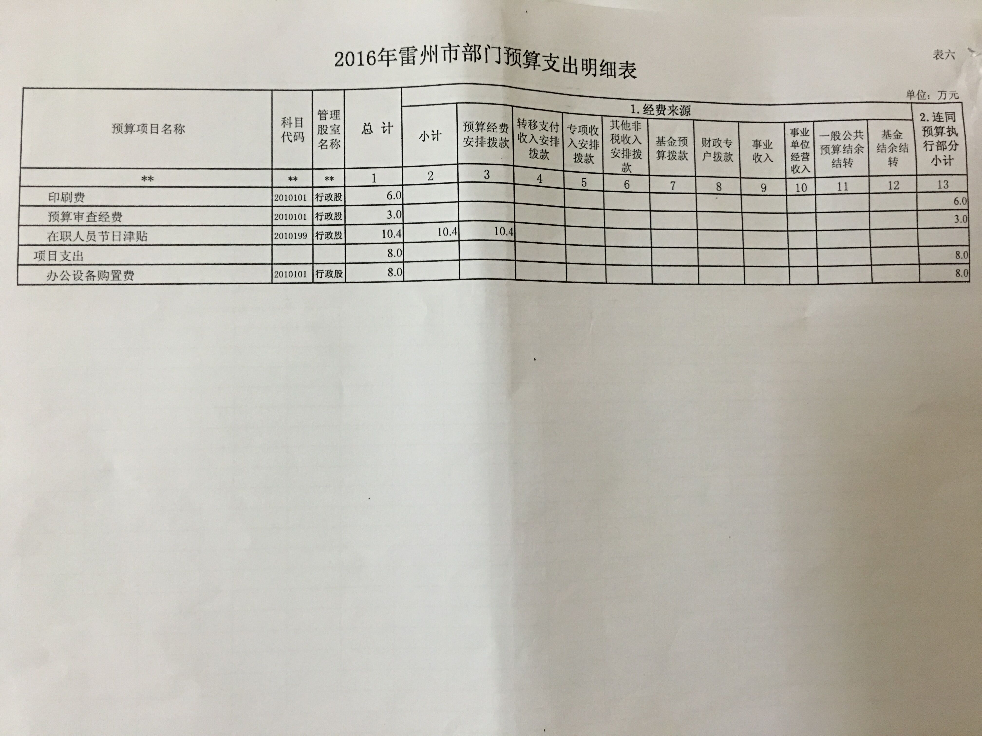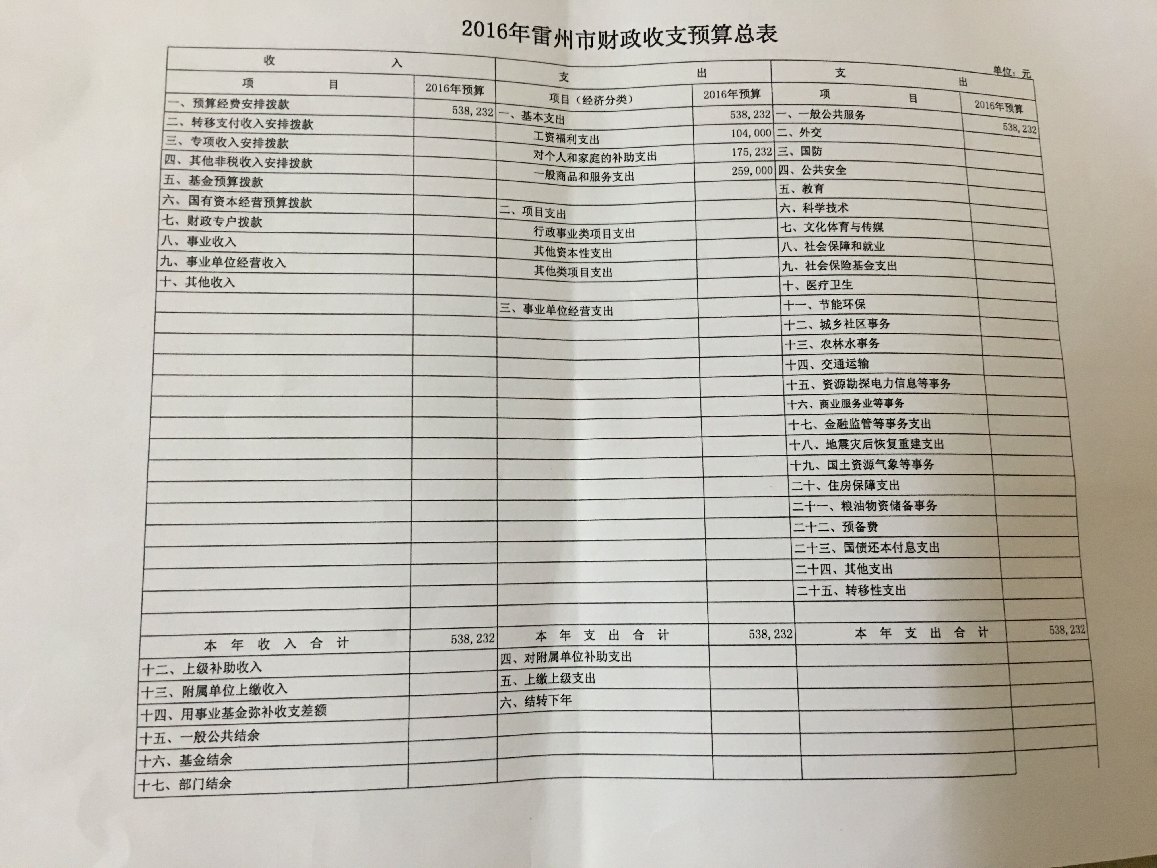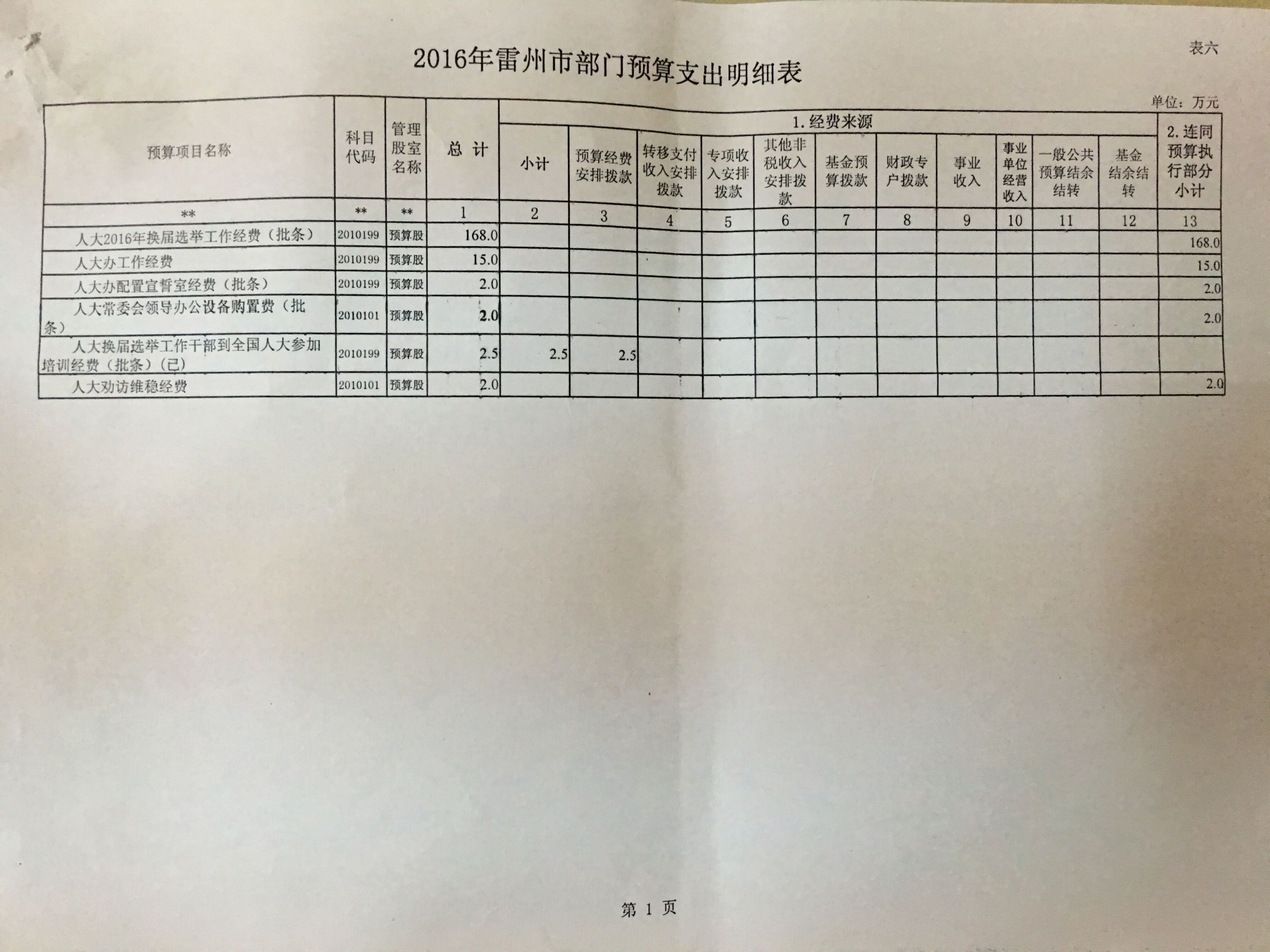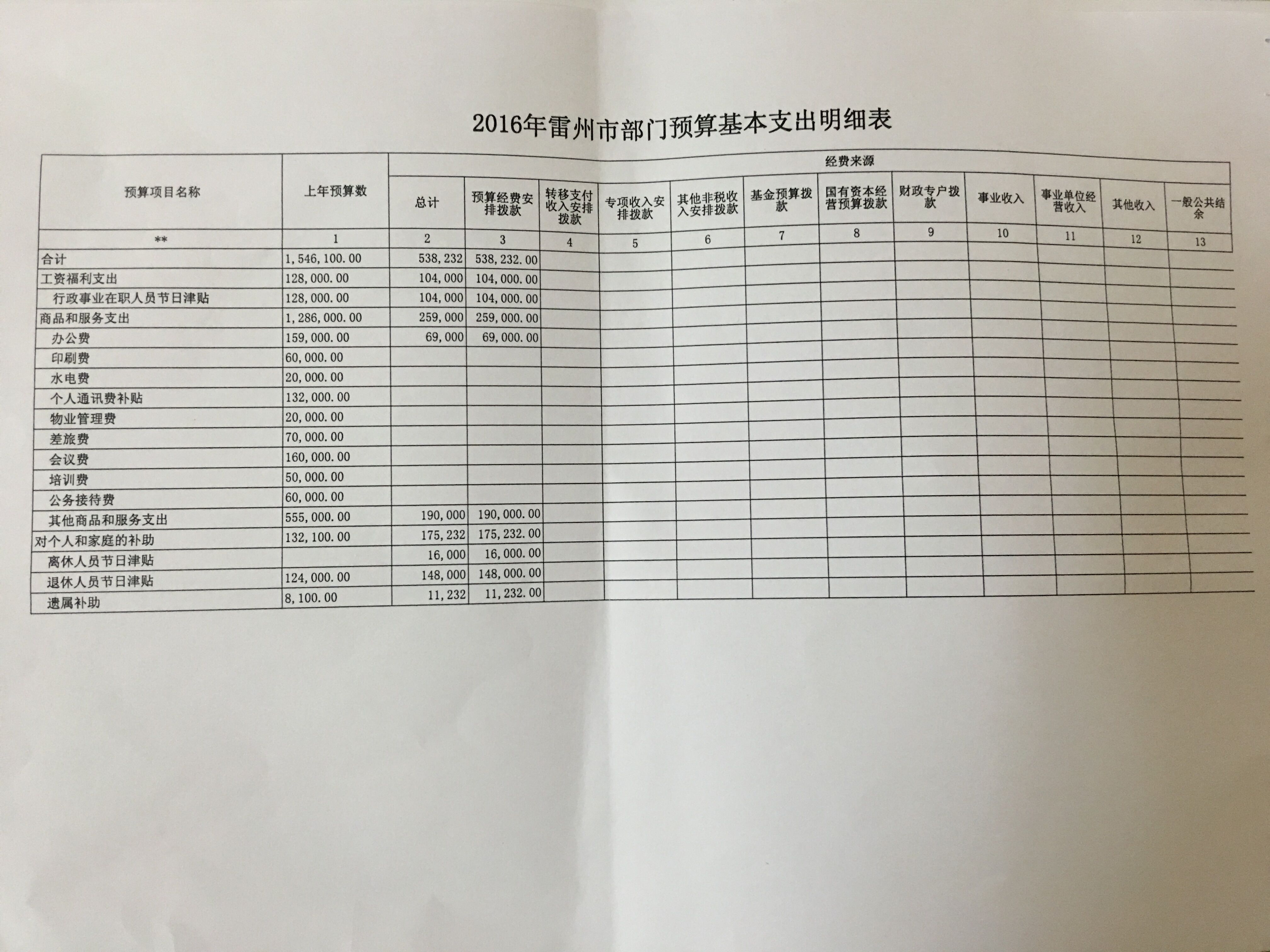 雷州市人大办公室2016年预算公开