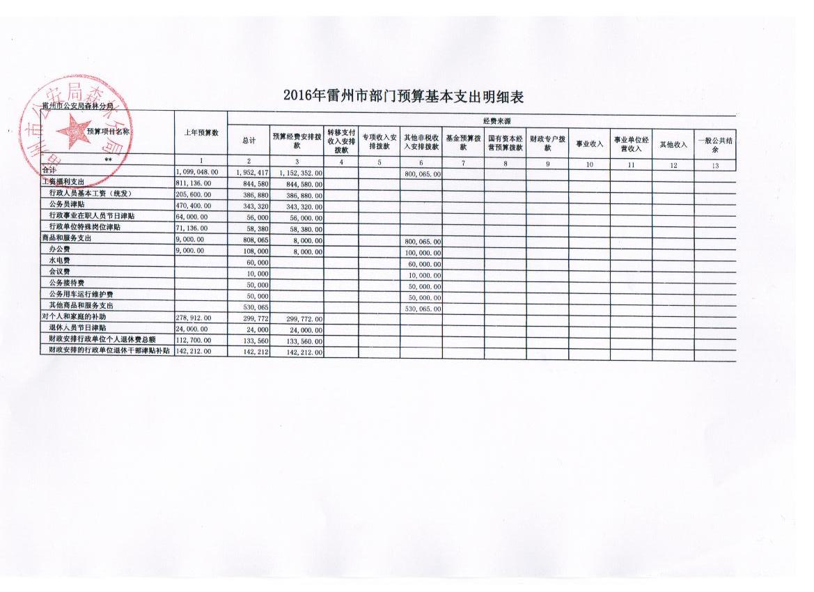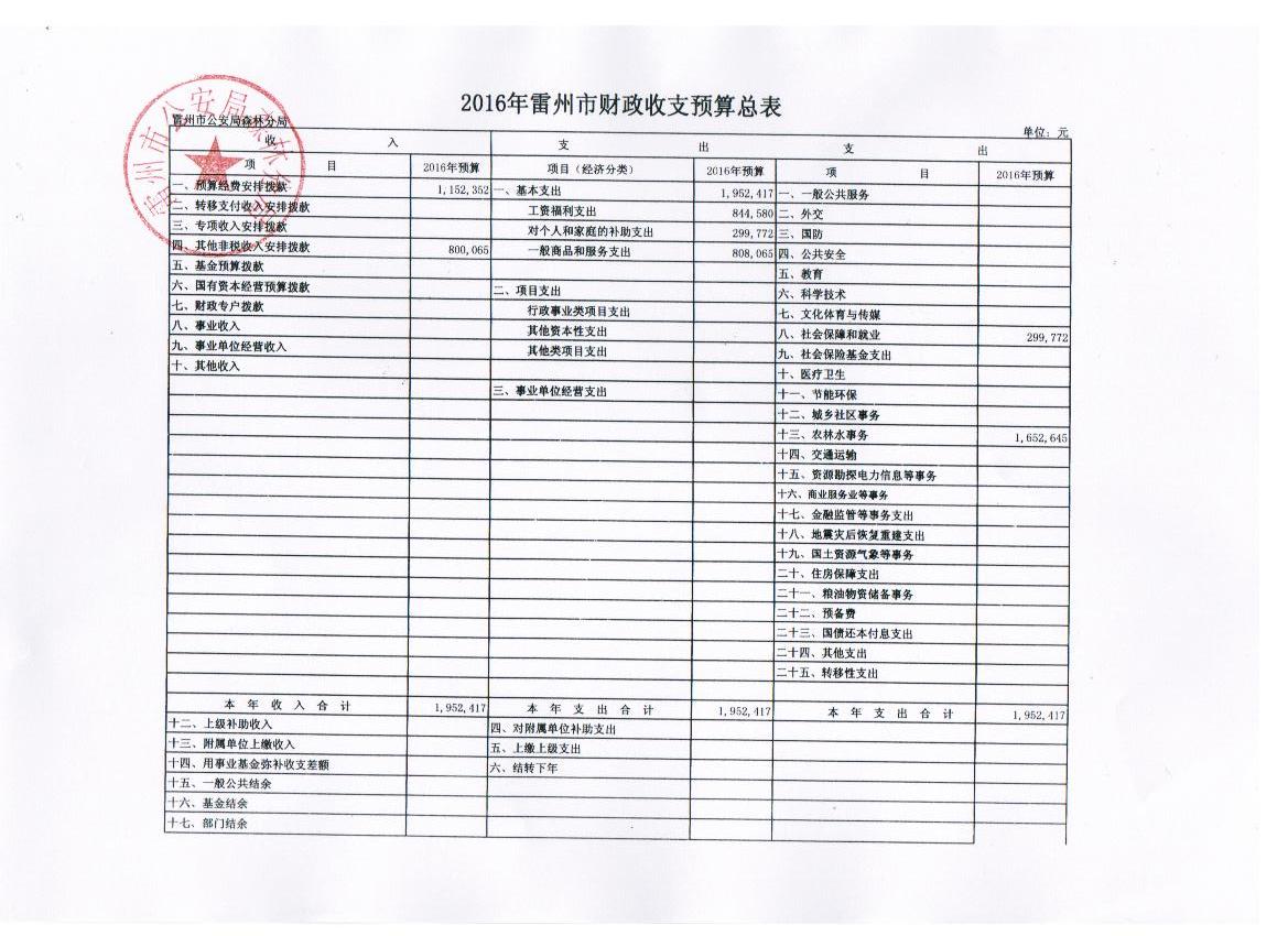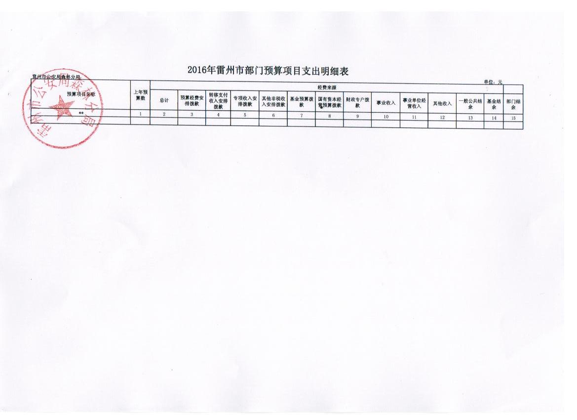 雷州市公安局森林分局2016年财政预算
