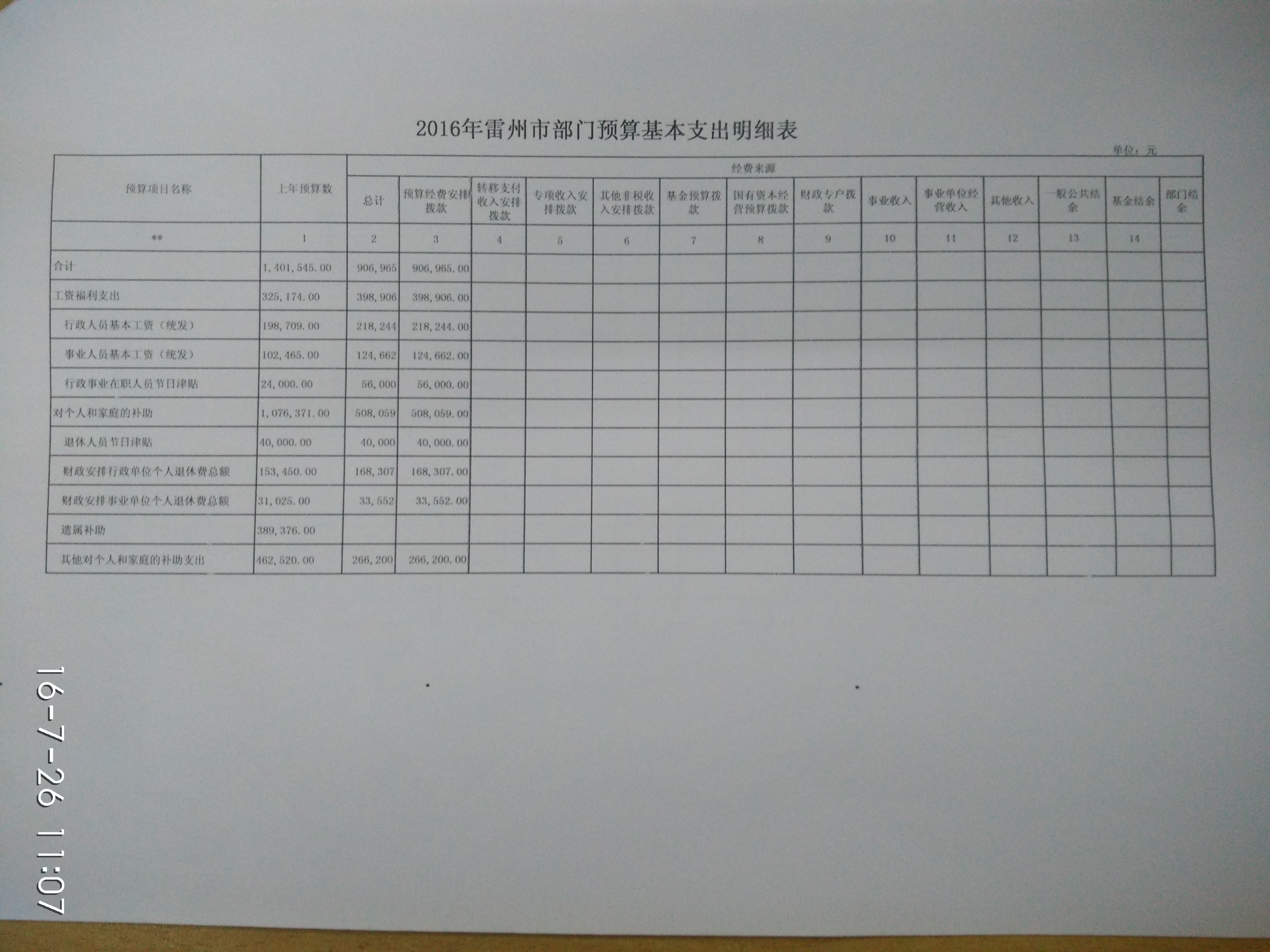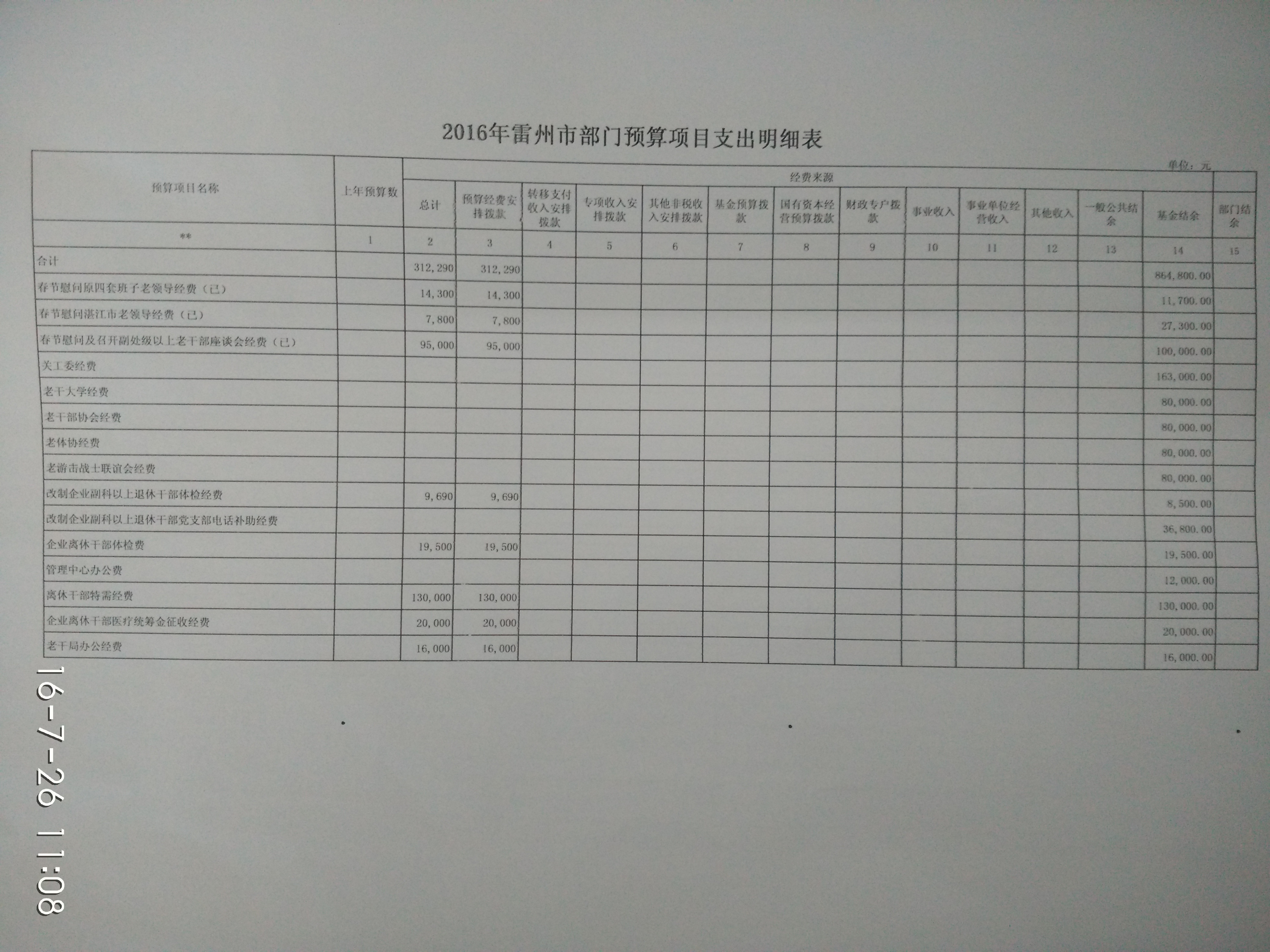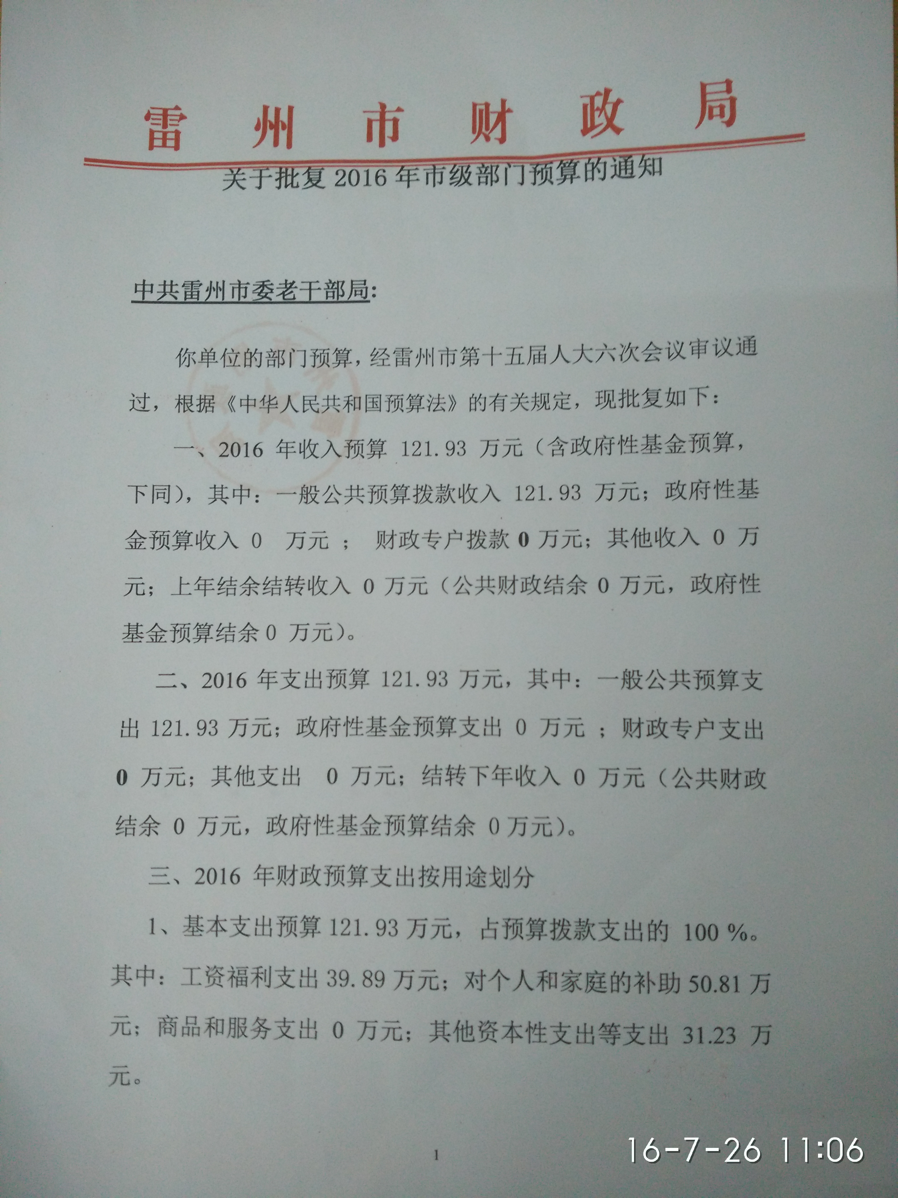 雷州市老干部局2016年财政预算