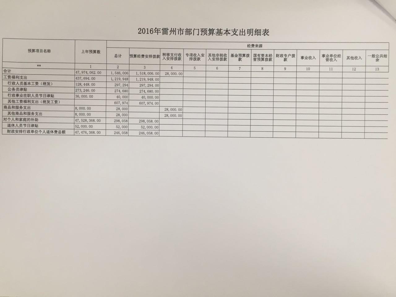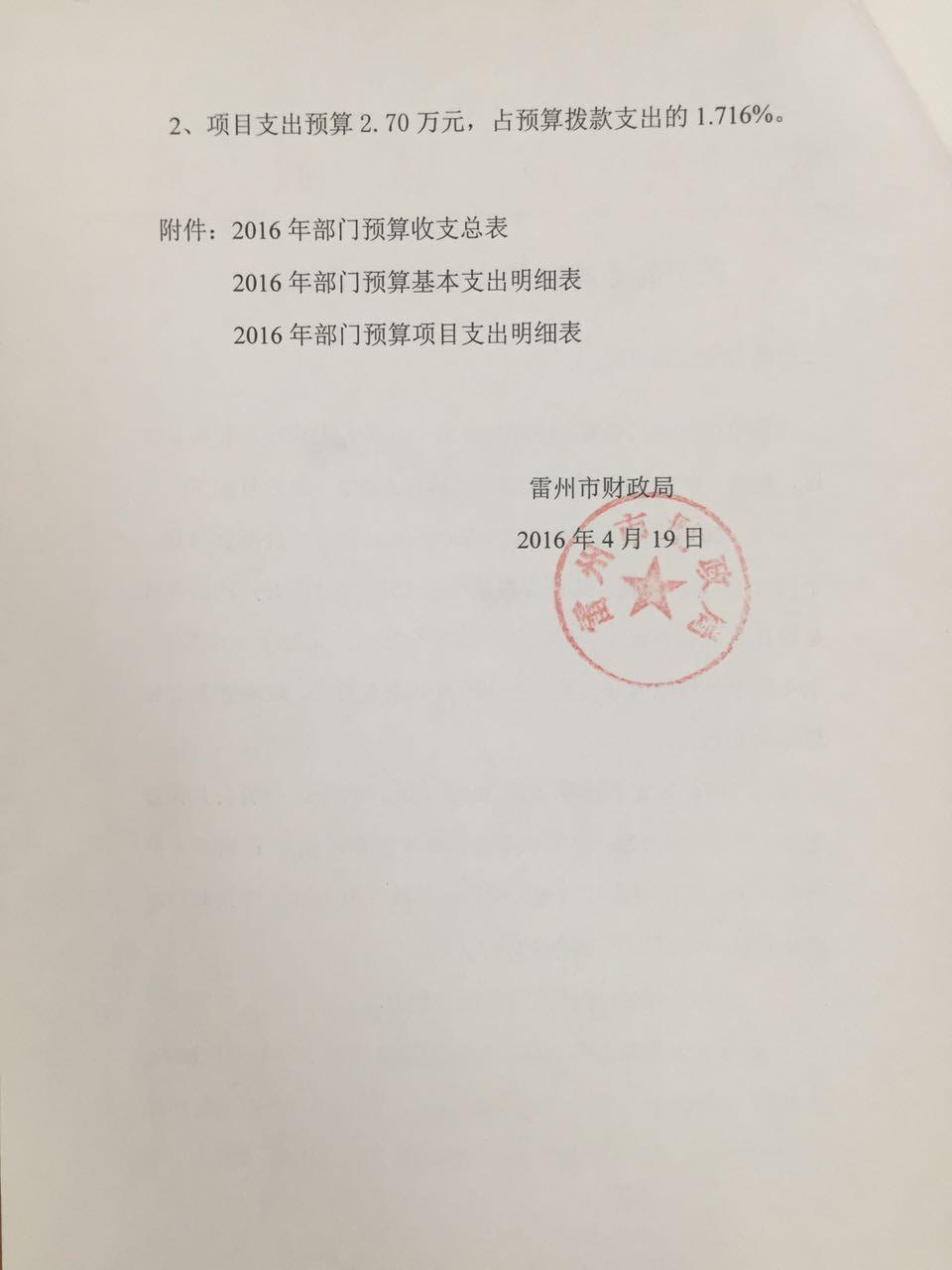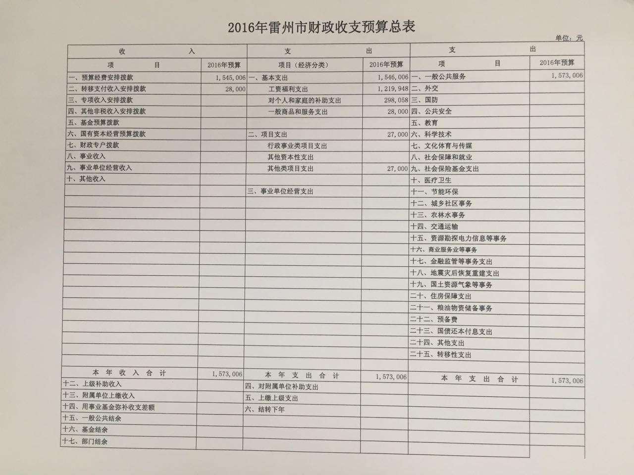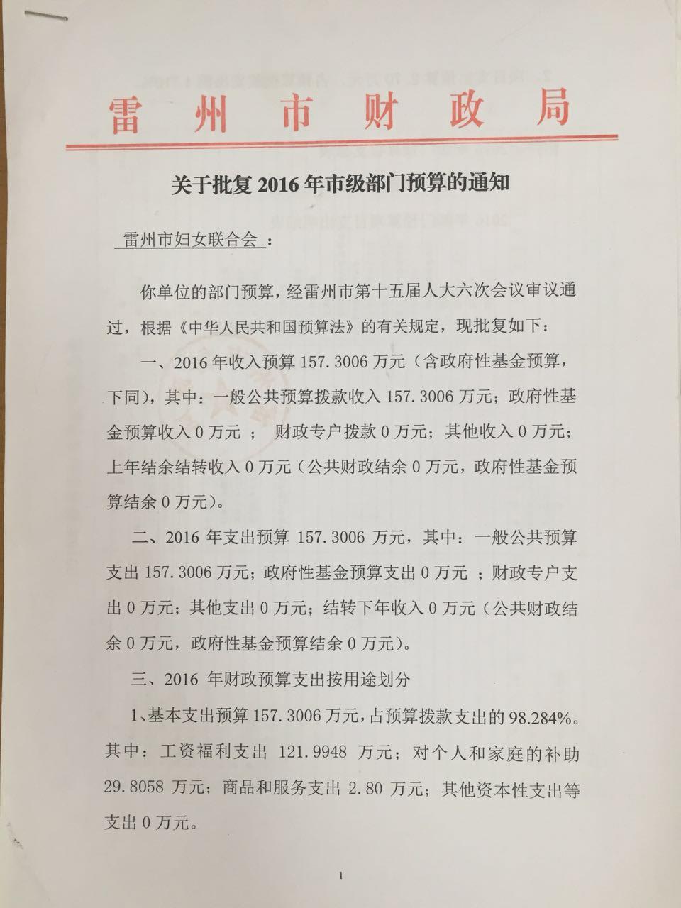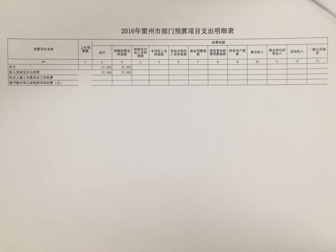 雷州市妇联2016年财政预算