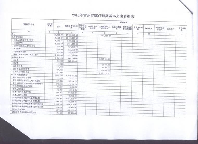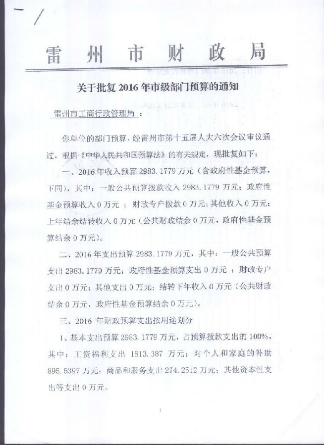 2016年雷州市工商行政管理局预算批复公开