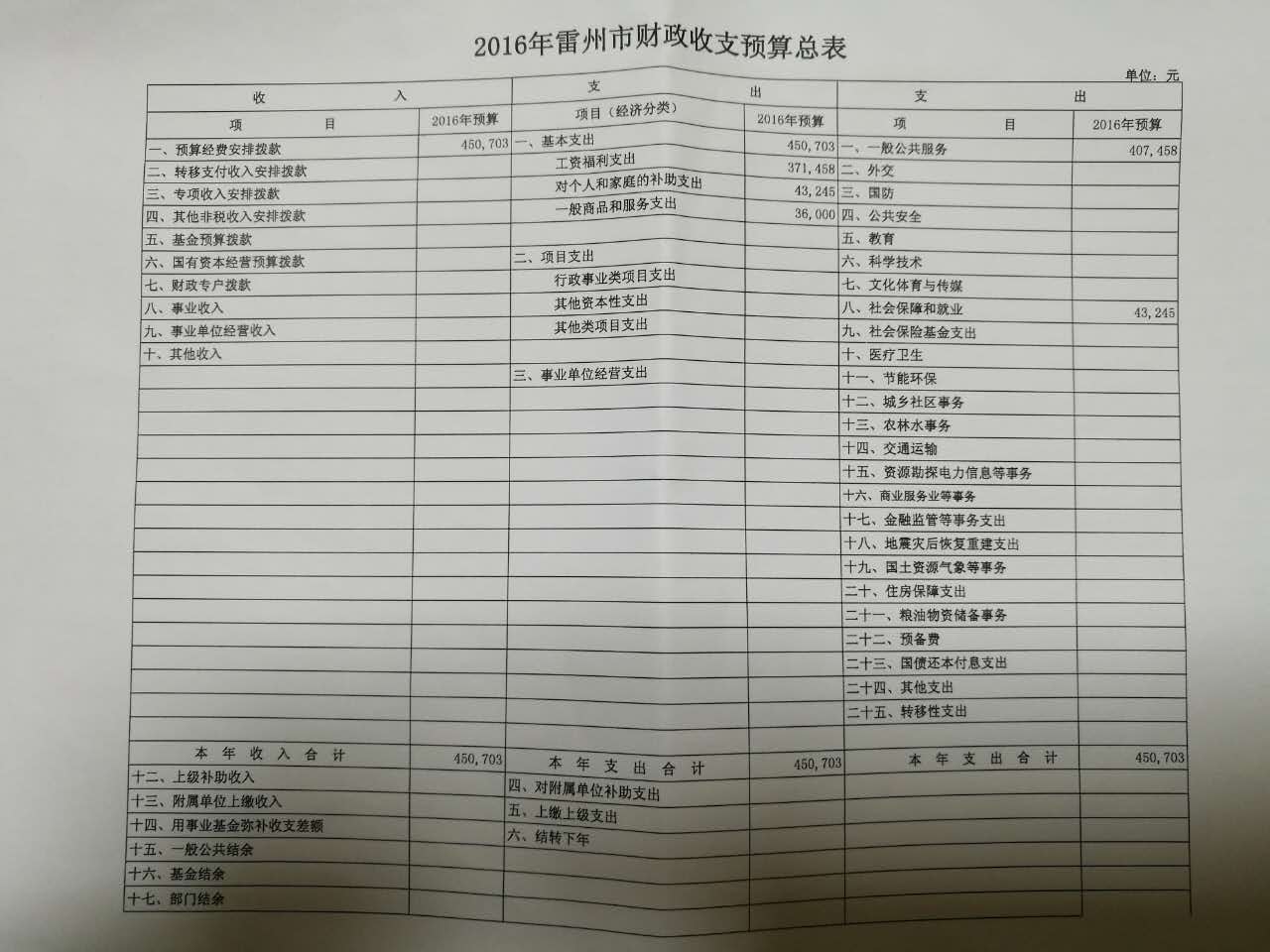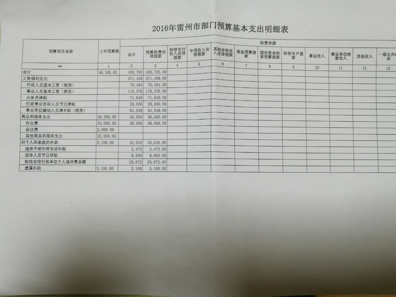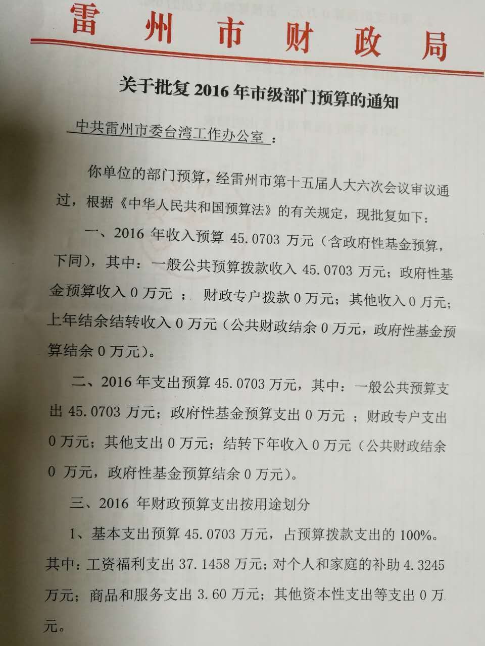 2016年雷州市委台湾工作办公室预算批复公开
