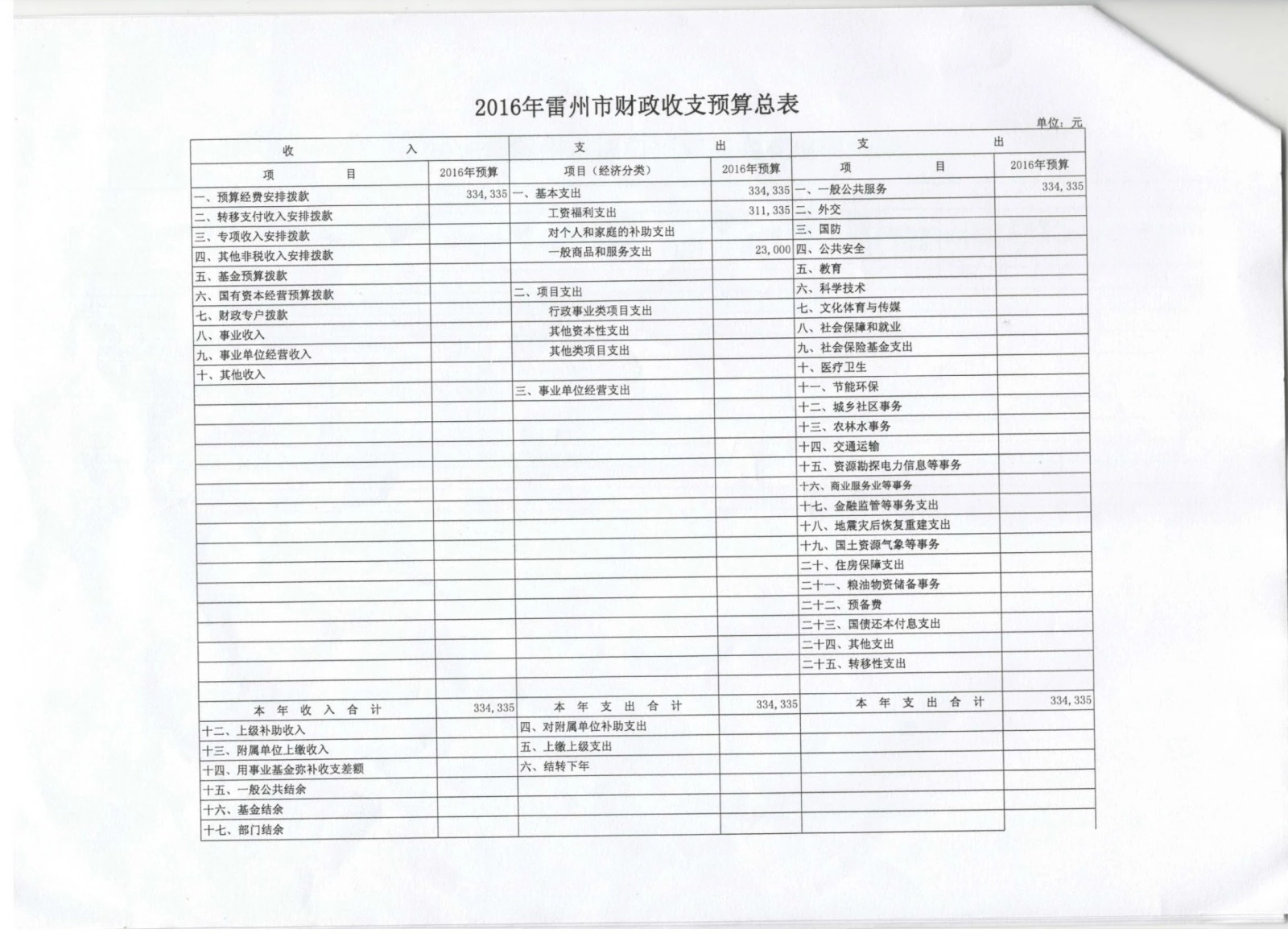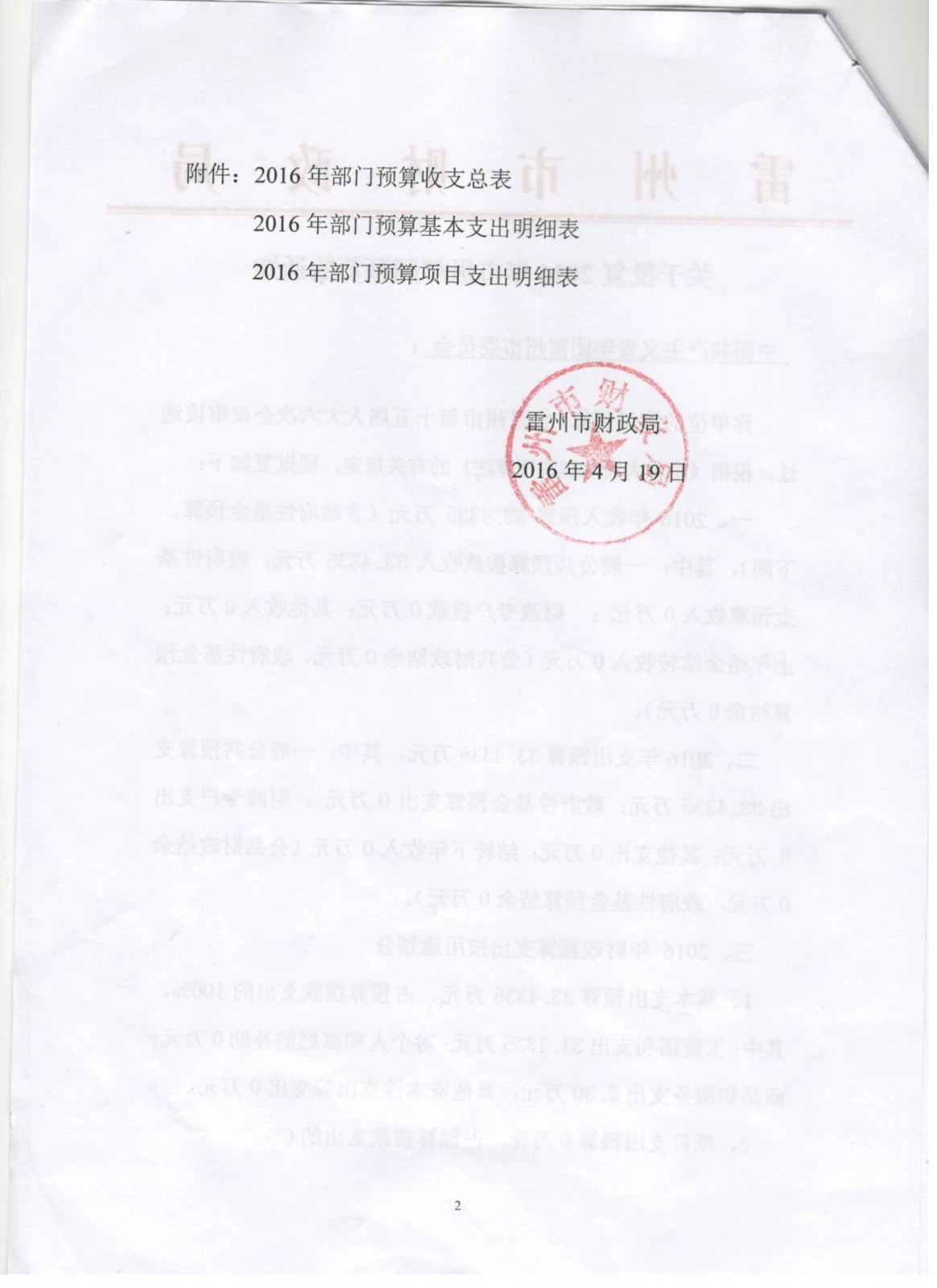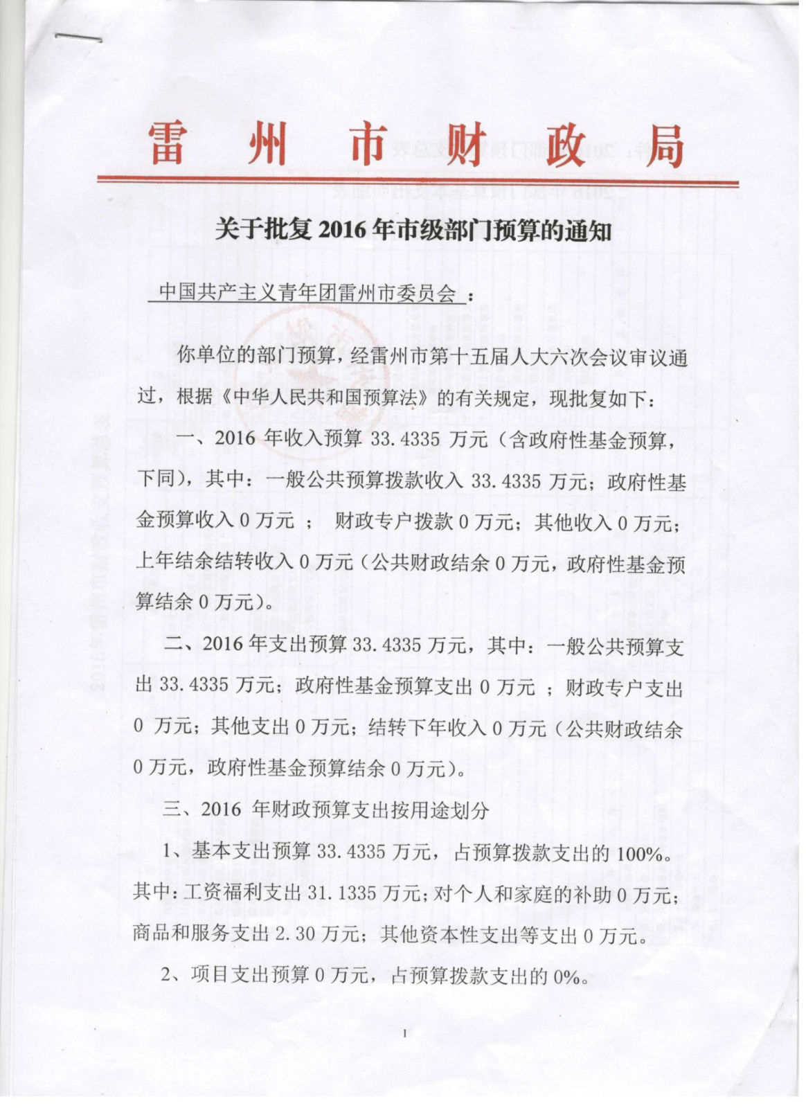 2016年雷州市中国共产主义青年团雷州市委员会预算批复公开