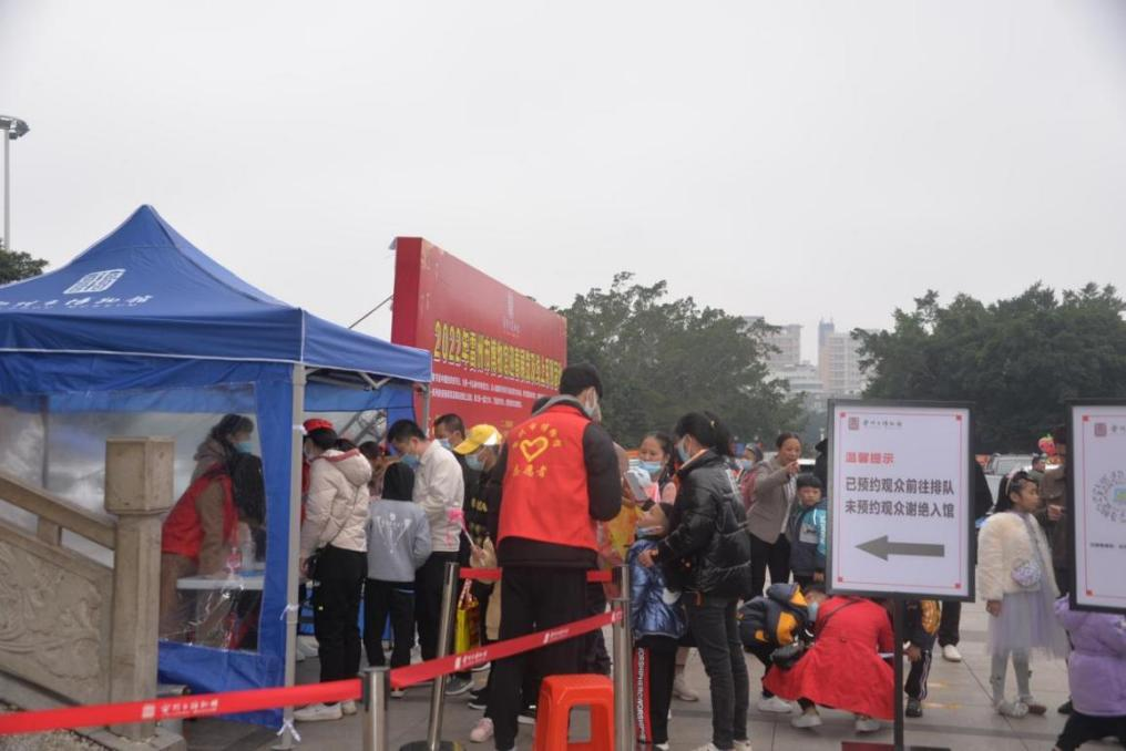 在排队等待入馆参观游览的人群中,志愿者们忙碌的身影格外显眼,他们为前来参观的游客提供咨询和引导。为配合我馆为切实做好疫情防控工作实施的“预约参观、限流进场、测温、扫码、保持安全距离”等措施,他们细心地为参观游客讲解预约进馆的操作步骤,提醒游客出示粤康码与行程卡,为游客测量体温,指引游客扫码入馆参观。
