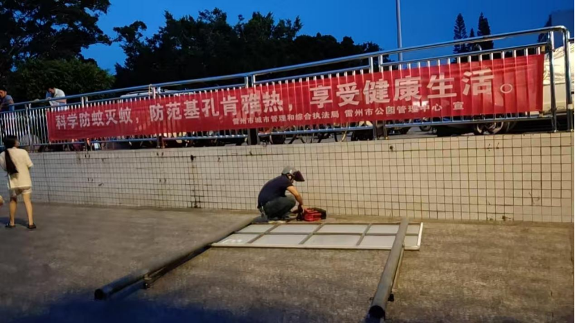 雷州市城管执法局组织各服务公司工作人员,每日分成5个工作组,共投入消杀工作人员约350人次,在市区主要路段、背街小巷、垃圾中转站等重点地段的污水管道、下水道基、公厕各类蚊蝇滋生地进行了全方位的喷洒药物灭杀工作,投放“高效氯氰菊酯”等药物灭杀蚊虫。