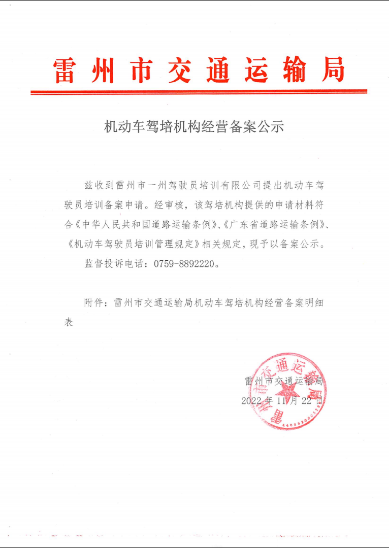 雷州市交通运输局机动车驾培机构经营备案明细表