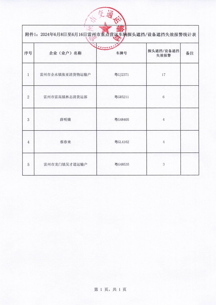 雷州市交通运输局关于2024年6月8日至6月16日营运车辆动态监控工作情况的通报(雷交运〔2024〕63号)