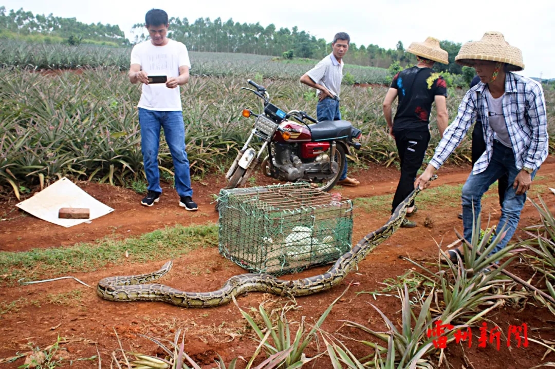 5月19日,雷州市英利自然资源所李连所长接辖区鹰峰岭脚下的青桐村村民彭勇报称其家中农场里出现一条约60斤的大蟒蛇,李连所长在当天8时向市自然资源局分管野生动物保护领导陈寒山副局长报告,陈寒山副局长在请示黄文驹局长同意后,立即指示英利林业站到场查看,并联系雷州市公安局森林分局进行现场处置。