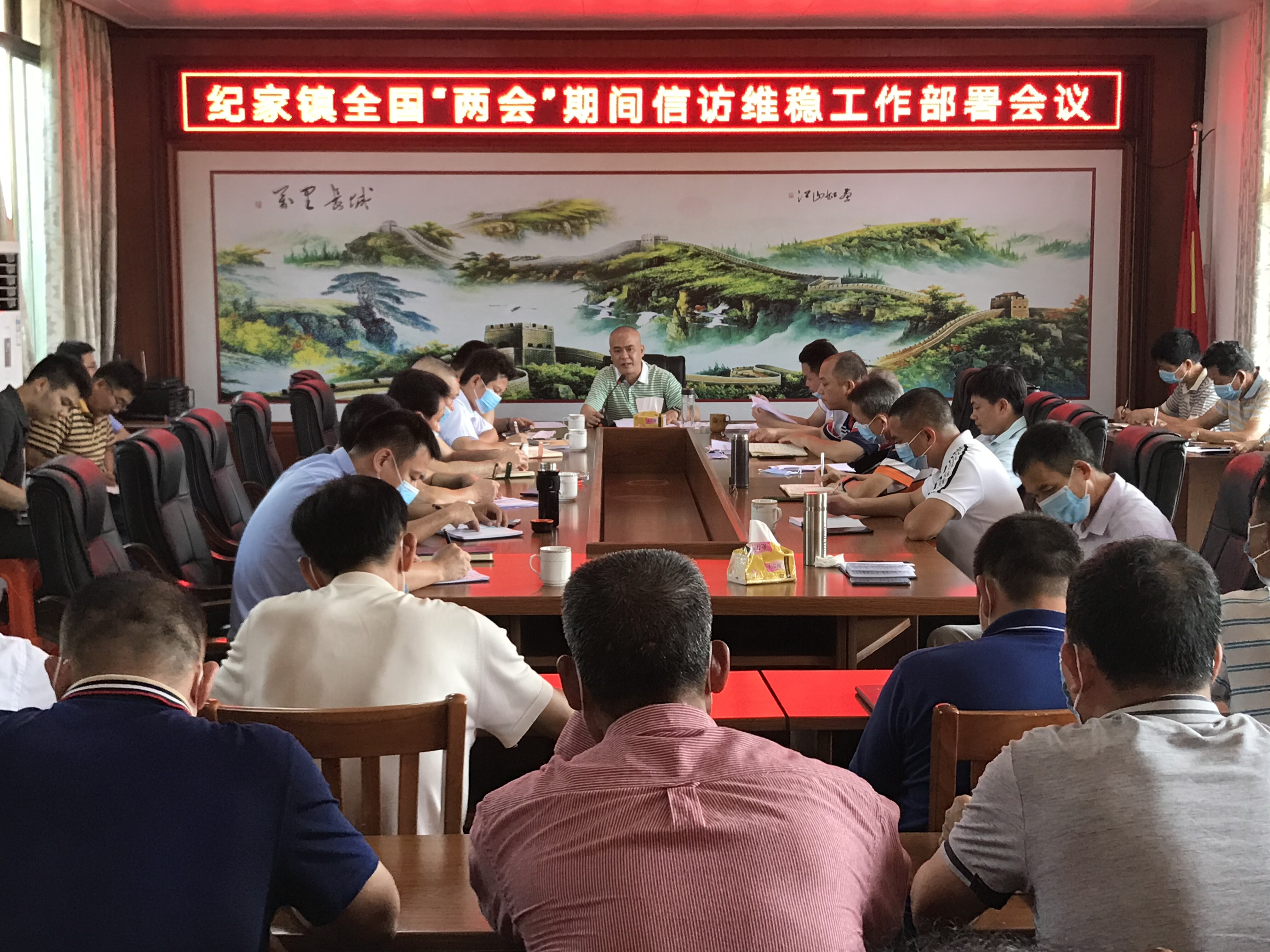 为进一步做好全国两会特防期我镇信访维稳安保工作,努力实现“五个坚决防止”和“六个不发生”的工作目标,为全国两会胜利召开营造良好的社会环境。2020年5月11日,纪家镇召开全国两会期间信访维稳工作部署会。镇党委书记陈小勇出席会议并做强调讲话,镇长许健平主持会议,镇党委副书记孙丙乔对全国两会期间信访维稳工作做了布置讲话,镇班子其他成员、各部门负责人、各村(社区)书记参加了会议。