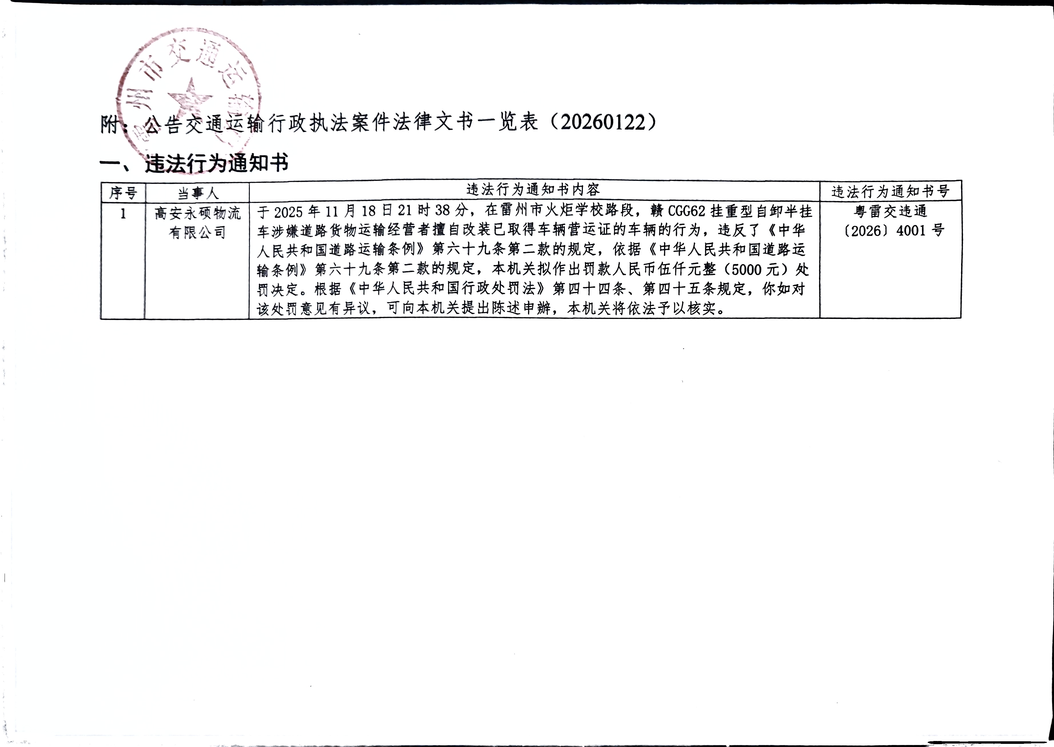 雷州市交通运输局关于送达交通运输行政执法案件法律文书的公告(20260122)