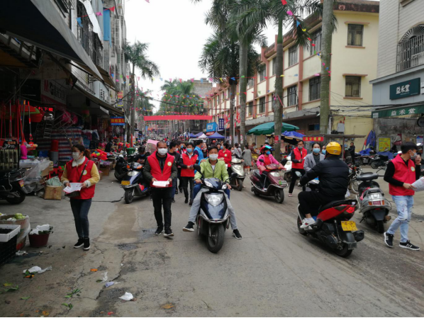 为贯彻落实习近平总书记关于志愿服务工作的重要指示批示精神和在统筹推进新型冠状肺炎疫情防控和经济社会发展工作部署会议上的重要讲话精神,根据市委市政府、团市委工作安排,2020年3月5日下午,我镇共青团委员会积极组织各村团干、团员志愿者共30余人组成共青团志愿者先锋队,在镇圩内开展疫情防控宣传活动,通过发放宣传单、宣传手册等方式,入户入店向广大群众发出“九要”“九不要”倡议,切实保障人民群众身体健康和生命安全,在践行雷锋精神的实际行动中助力打赢疫情防控阻击战,展示团员力量。