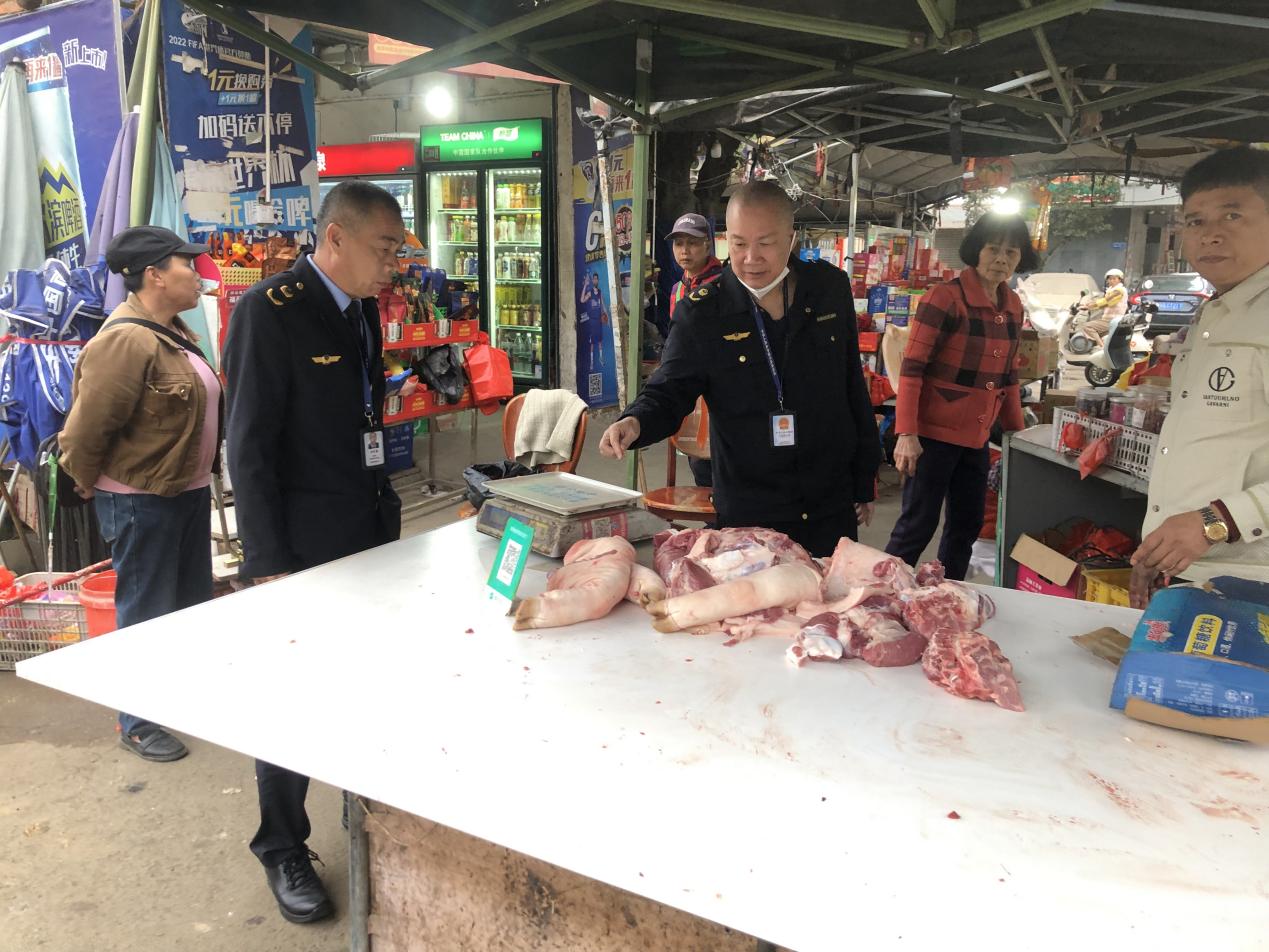 2025年2月20日,我局深入城区农贸市场及周边开展专项行动,共出动执法人员8人次,检查了33户猪肉经营户,查扣13家猪肉档口未经检验检疫猪肉共609.1斤。