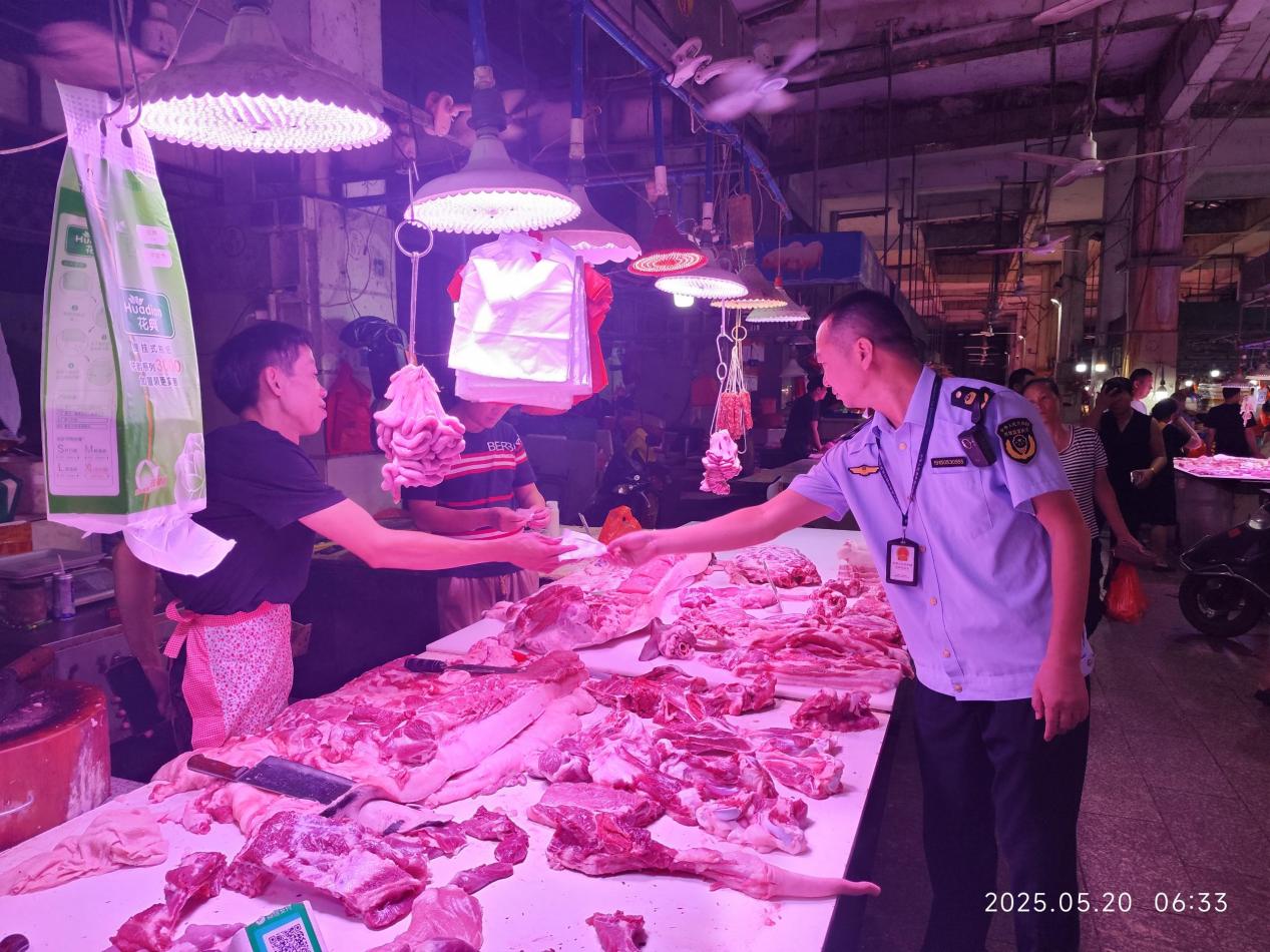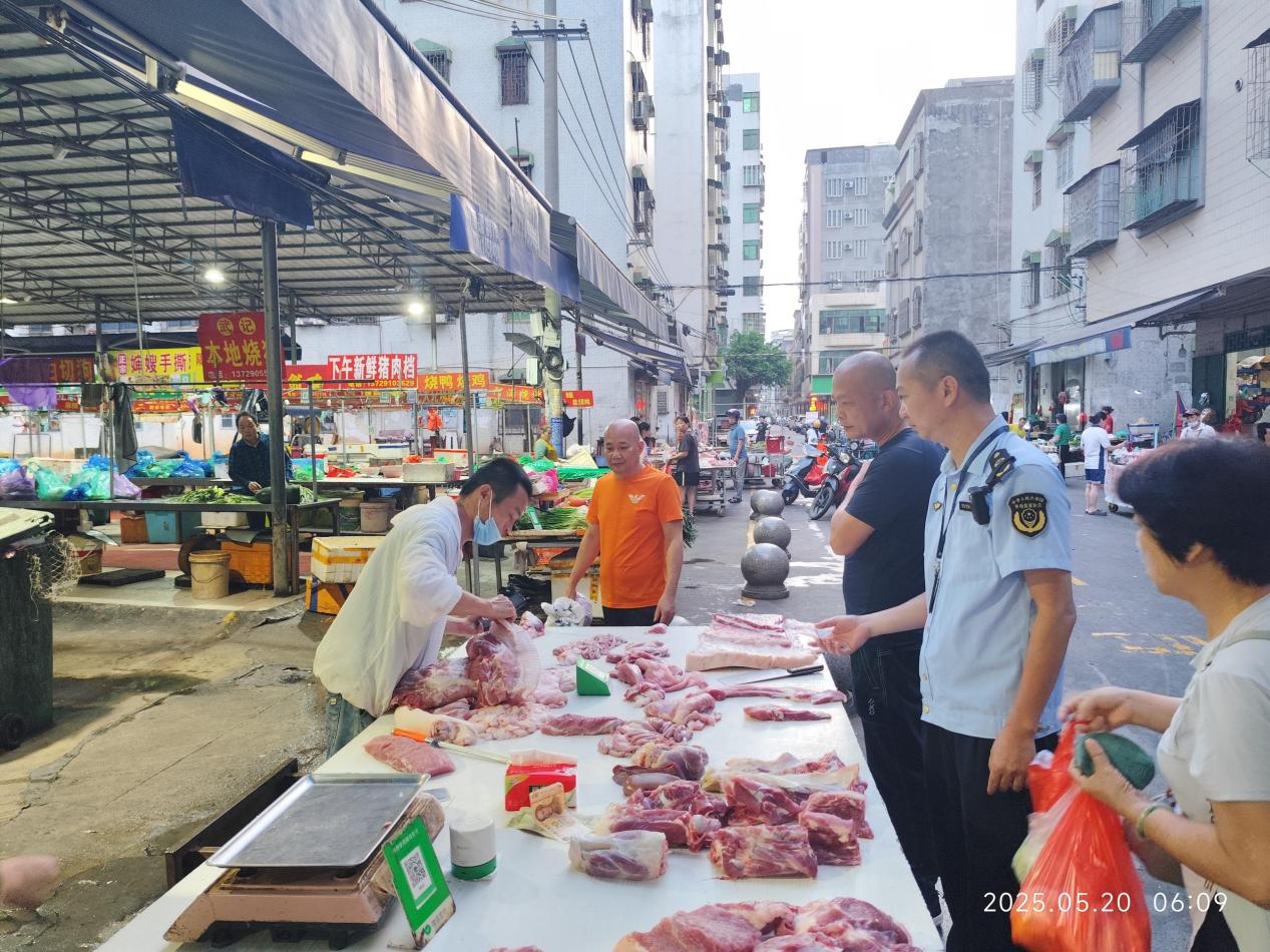 2025年5月20日,我局深入新湖、水店、上坡、官贸、天河、泰和、阳光尚景等7家农贸市场及周边开展专项行动,检查了63户猪肉经营户,查扣新湖、水店、阳光尚景等市场外周边13家非法经营未经检疫生猪肉品的摊档共698.8市斤生猪肉。