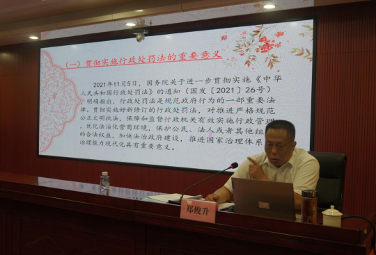 培训中,郑俊升同志通过详细解读重点法条、法制审核和听证程序实务操作讲解、分享典型案例等方式从意义、亮点、行政处罚普通程序、依法规范拆除违法建筑、行政执法实践中需注意的问题等方面对新修订《中华人民共和国行政处罚法》进行了深入浅出地讲授。并针对容易引起行政争议、导致行政败诉的执法突出问题形成的典型案例进行剖析讲解指导,将法律理论知识与执法实践紧密结合,指导性实用性操作性强。
