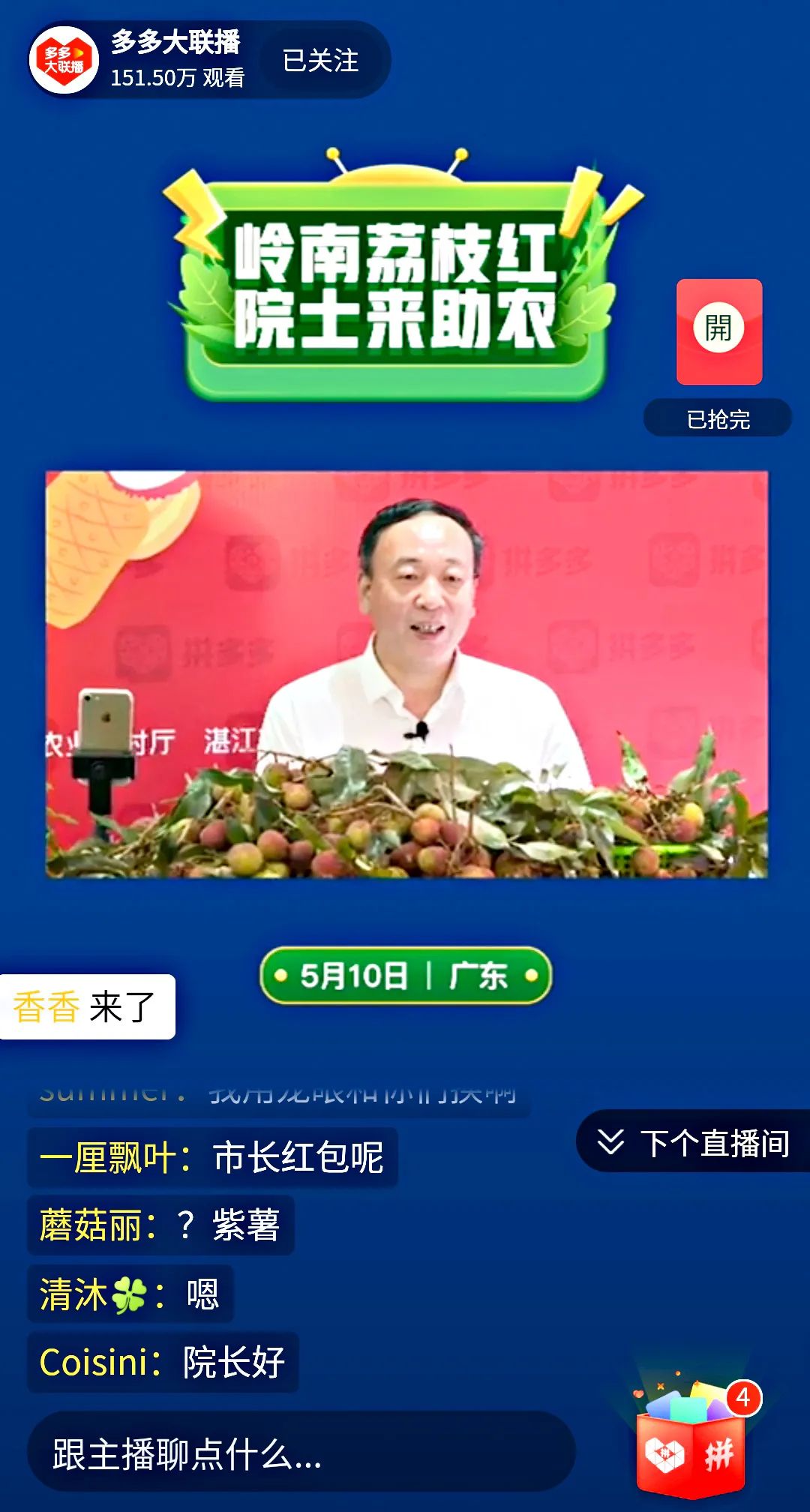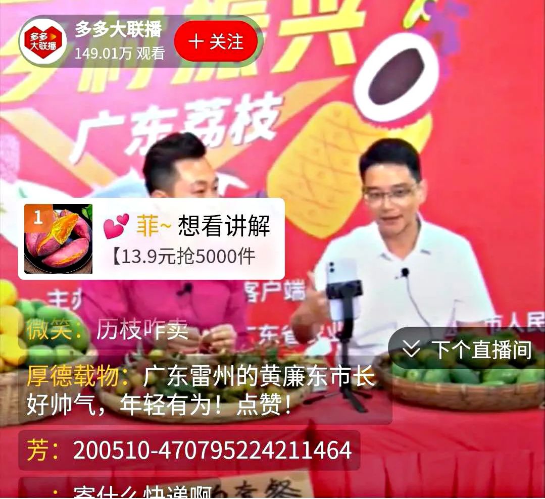 与此同时,远在广东省农业农村厅1号楼6层会议室广州会场“多多大联盟爱心助农”直播间,中国工程院赵春江院士不时对雷州市人杰地灵及物产丰饶等方面给予肯定和点赞,并热心向全国广大网友推介雷州的特色农产品。受此超强阵容联手的助推,在多多大联盟爱心助农直播间评论区的参与互动十分踊跃,雷州荔枝和芒果线上营销的热度不断攀升,全国各地网友们的购物热情只是瞬间就迅速被点燃,短短半个小时,直播间涌入了近100万名网友观看。