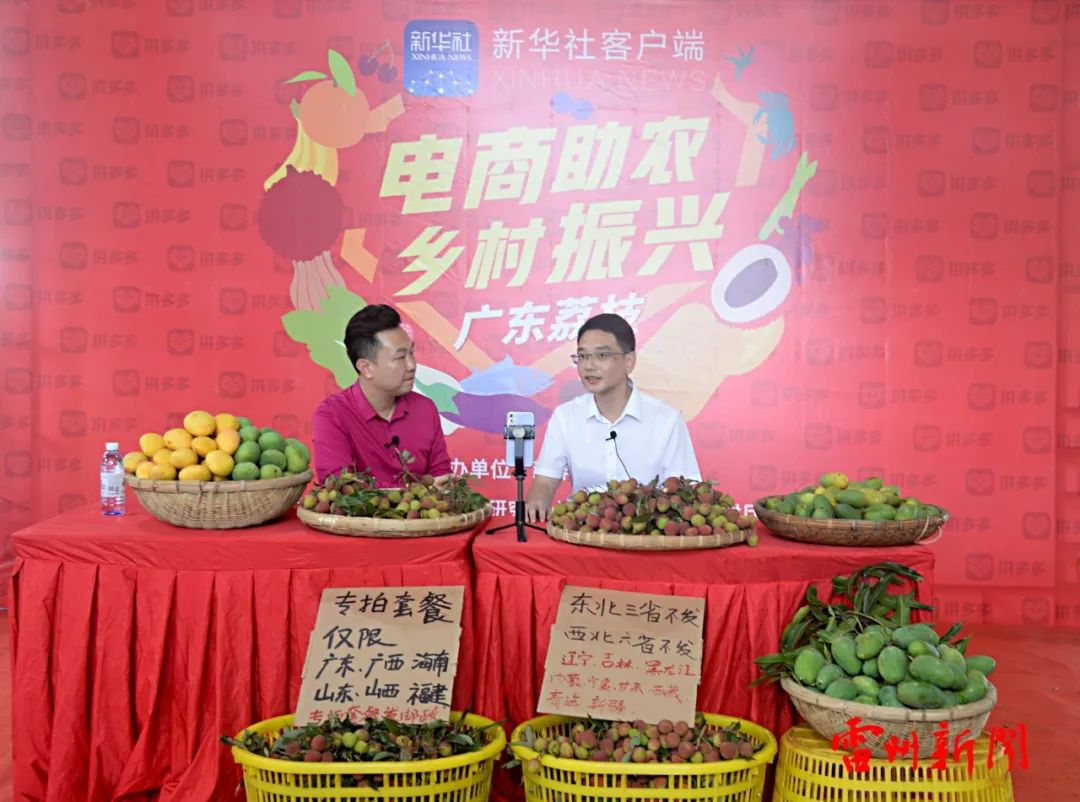 电商助农,振兴乡村。5月10日,中国工程院院士赵春江与雷州市委副书记、市长黄廉东携手,齐齐亮相新华社客户端的直播间,为雷州市2万多亩荔枝和5万多亩芒果代言,向屏幕前全国各地亿万观众推介雷州荔枝和芒果。当天超强阵容的上镜直播,将雷州荔枝和芒果从线下推向线上“云”端,让其飘向五洲四海。直播仅1个小时,170万人次在线观看,后几个小时间达成线上订单8000多件3万多市斤,销售金额27多万元。