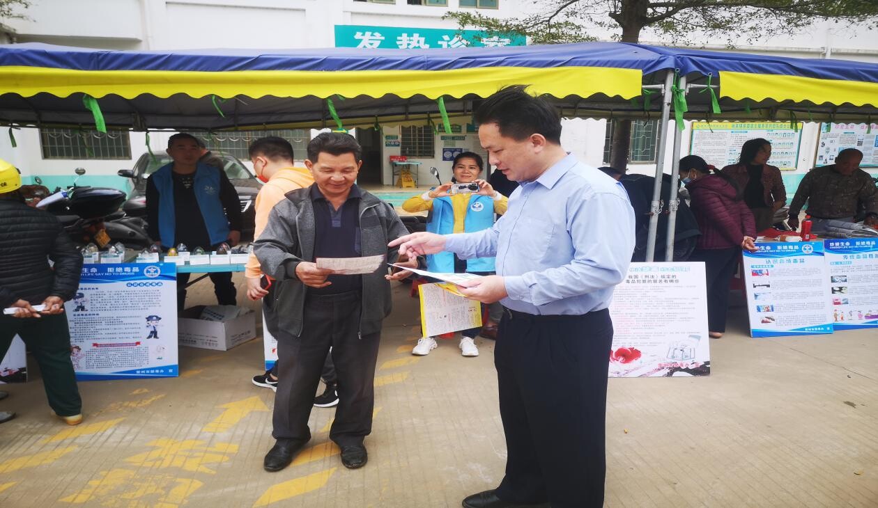 活动中杨家镇党委书记梁张照同志和党委副书记沈忠明同志通过分发禁毒及反诈宣传单、摆放禁毒宣传展板、并引导群众下载“国家反诈中心”APP,保护人民的钱袋子、现场向来打疫苗的群众,特别是易受侵害的老人小孩弱势群体讲解普及新型诈骗手段和毒品的危害和防范技巧,强调禁毒的必要性,号召大家“动员起来,打一场禁毒、反诈的人民战争”。通过宣传使广大矫正人员有深刻反诈意识和反诈能力了解毒品的危害,为创造稳定、和谐的无毒生活环境而努力。此次活动,共发放禁毒、反诈、反邪教、扫黑除恶宣传