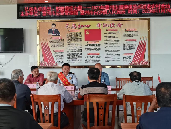 弘扬先进典型、彰显榜样力量。2023年11月24日,由雷州市应急管理局、雷州市白沙镇人民政府主办的“弘扬先进典型、彰显榜样力量——雷州市2023年道德模范巡讲进农村活动”在雷州市白沙镇调爽村委会举行。
