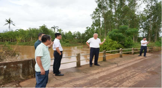 随后,程进一行来到北和镇鹅感村委会迈碳村实地查看危桥和堤坝安全管控情况。该村因地势低洼,台风期间村庄农田大面积受浸,造成严重经济损失。在实地走访中发现,当前河水水量仍然较大,部分桥梁仍处于被水淹没状态,但现场既未实施封桥封路措施,也未设置任何警示标识,存在较大安全隐患,暴露出属地在风险管控方面存在缺位。程进指出,属地政府和行业主管部门要切实履行主体责任,坚决克服麻痹大意思想,及时处置消除风险隐患。他强调,要把保障群众生命安全放在首位,对存在安全隐患的桥梁、道路要立即封闭管控,安排专人巡查值守,坚决防止次生事故发生。同时,要举一反三全面排查因积水、塌方、路基受损等可能引发安全风险的道路桥梁,切实筑牢群众出行安全防线。