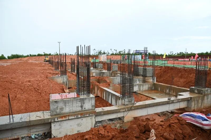 当天上午持续大雨,吴松江一行撑伞深入项目建设现场,查看“项目进度计划横道图”,随后通过项目实名制通道进入机库及附楼基础工程等施工区域,实地察看工程建设进展。该项目于2025年3月28日正式动工,经过五个多月的紧张施工,已顺利完成场地清平、土石方开挖、机库及附楼桩基建设等工程,目前正推进机库钢柱吊装及拉杆等工作。受天气影响,现场部分机械和工人暂未作业。